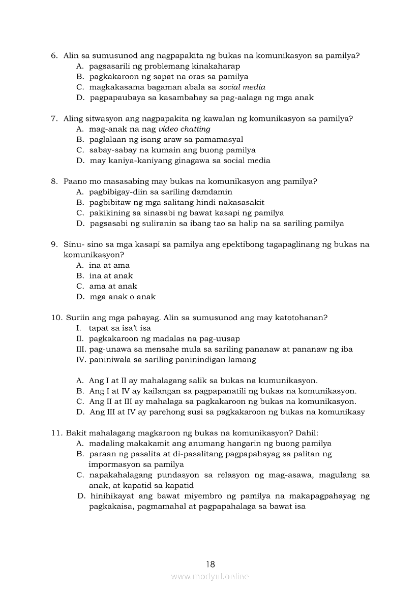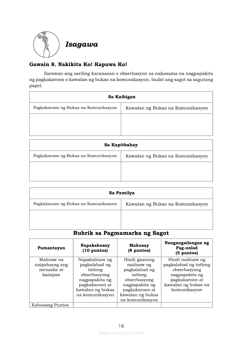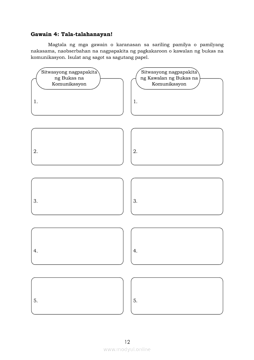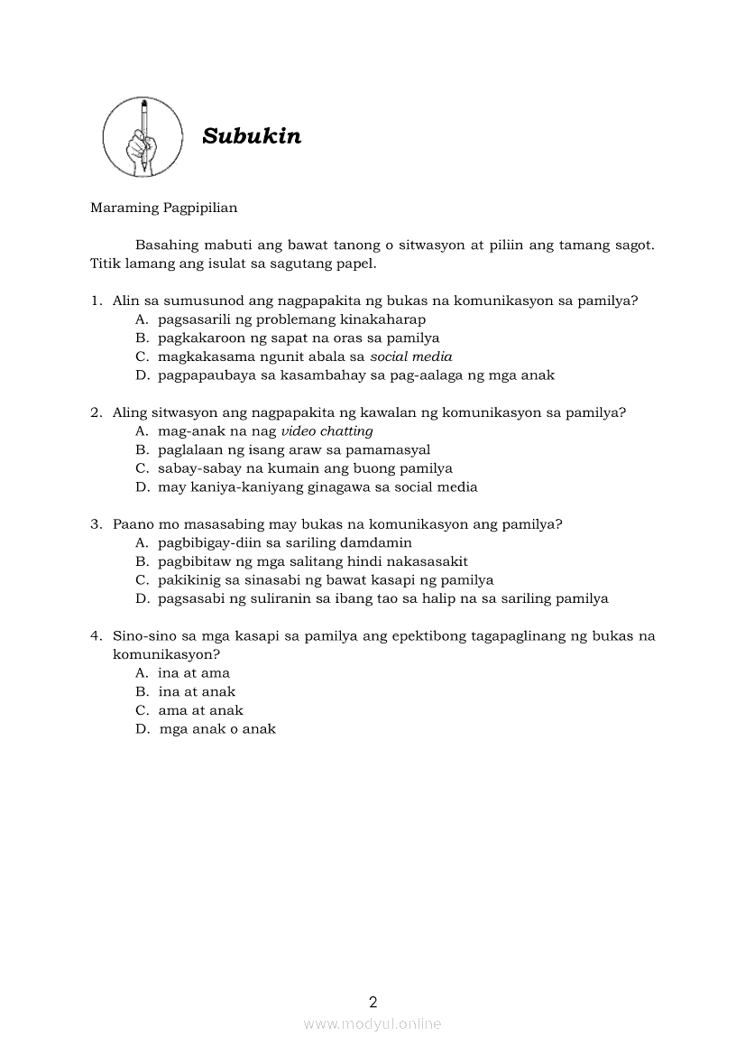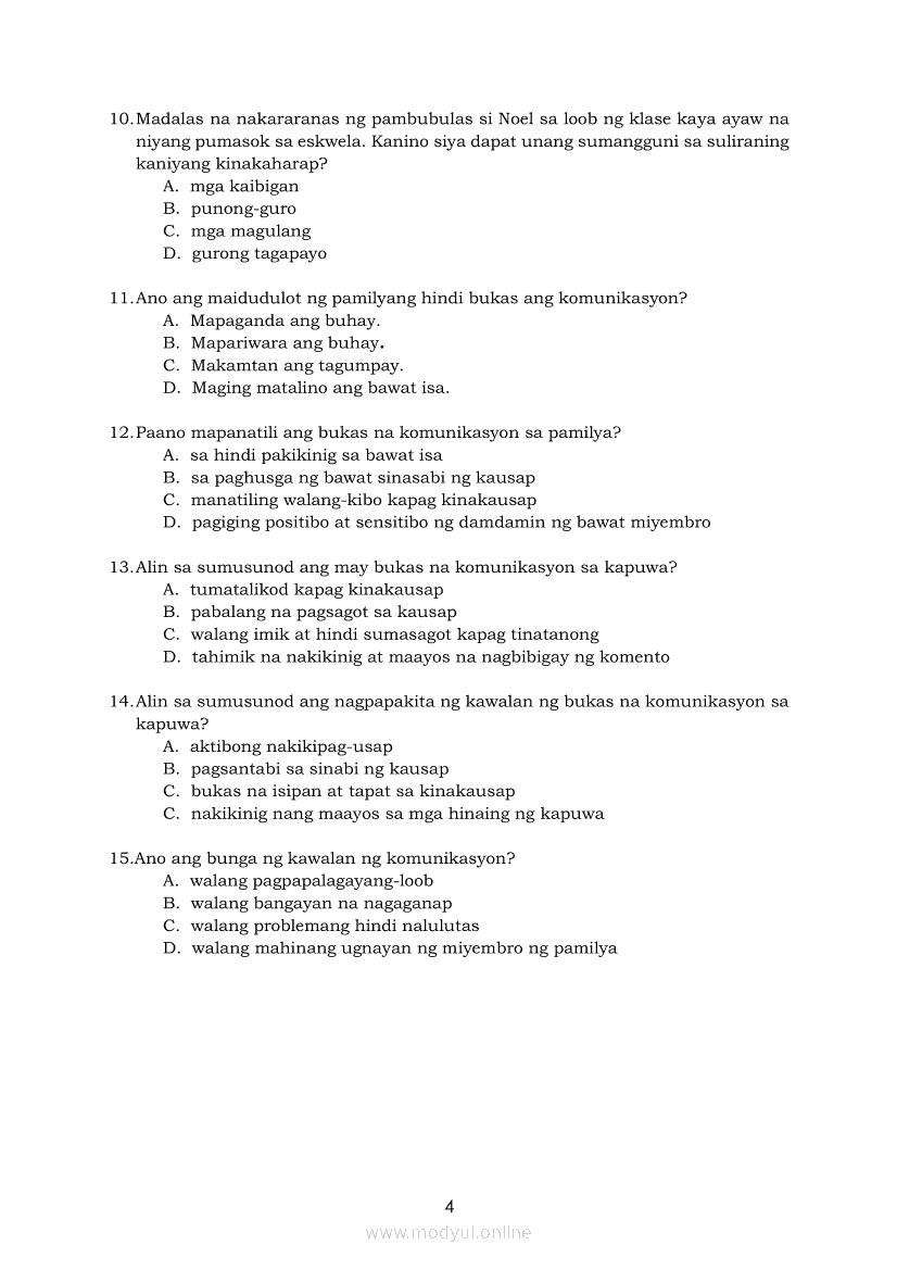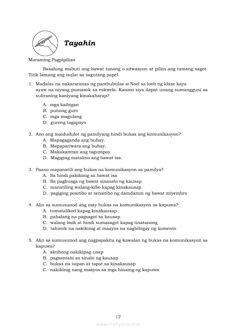 Edukasyon sa Pagpapakatao 8 Modyul 9: Pagkakaroon o Kawalan ng Bukas na KomunikasyonApr 22, 2021 Grade 8Xiaomi Redmi Watch 5 Active 2inch LCD Display Clear Calling 5ATM Waterproof Smart Watch for only ₱3,999 ₱1,200!. Edukasyon sa Pagpapakatao 8RelatedEdukasyon sa Pagpapakatao Ikaapat na Markahan – Modyul 12.A Katapatan sa Salita at Gawa (Linggo: Una)Edukasyon sa Pagpapakatao Ikaapat na Markahan – Modyul 14.B Karahasan sa Paaralan ( Linggo: Ika-anim )Edukasyon sa Pagpapakatao Ikaapat na Markahan – Modyul 12.B Katapatan sa Salita at Gawa (Linggo: Ikalawa)Edukasyon sa Pagpapakatao Ikaapat na Markahan – Modyul 14.A Karahasan sa Paaralan (Linggo: Ikalima)Edukasyon sa Pagpapakatao Ikaapat na Markahan – Modyul 13.B Ang Seksuwalidad ng Tao (Linggo: Ikaapat)