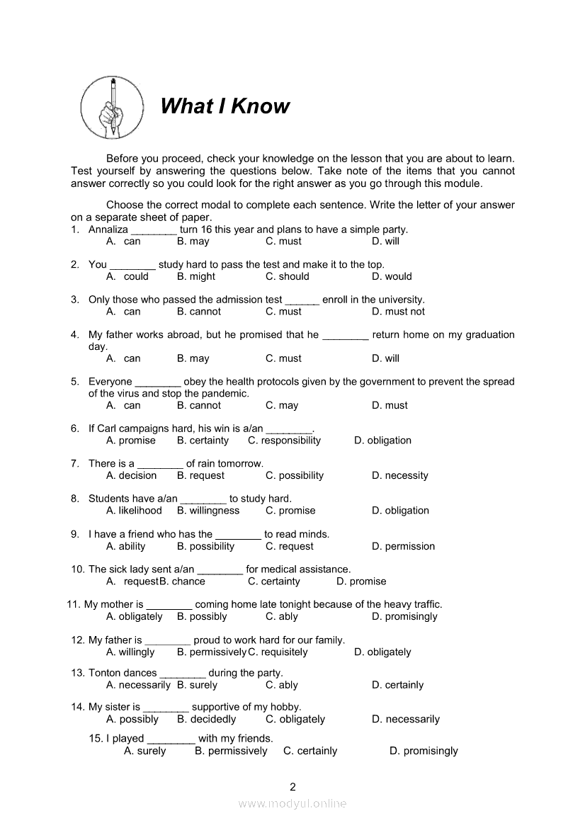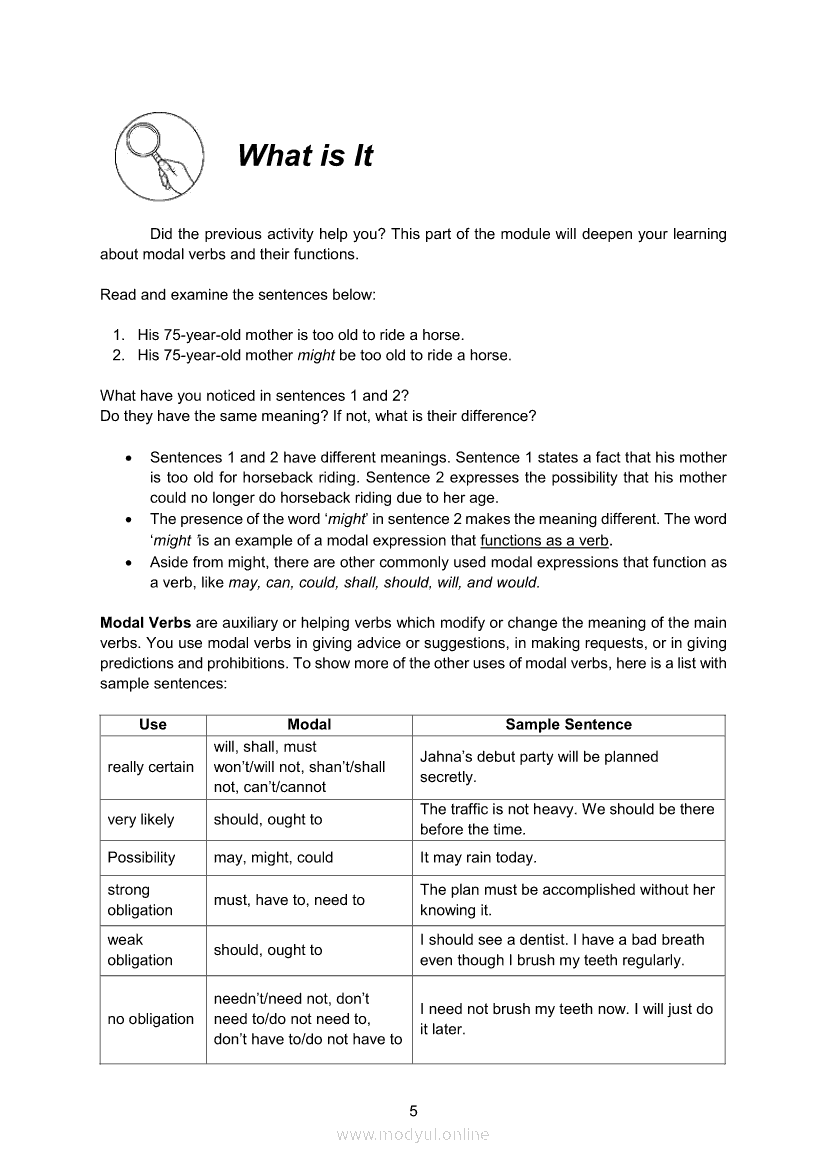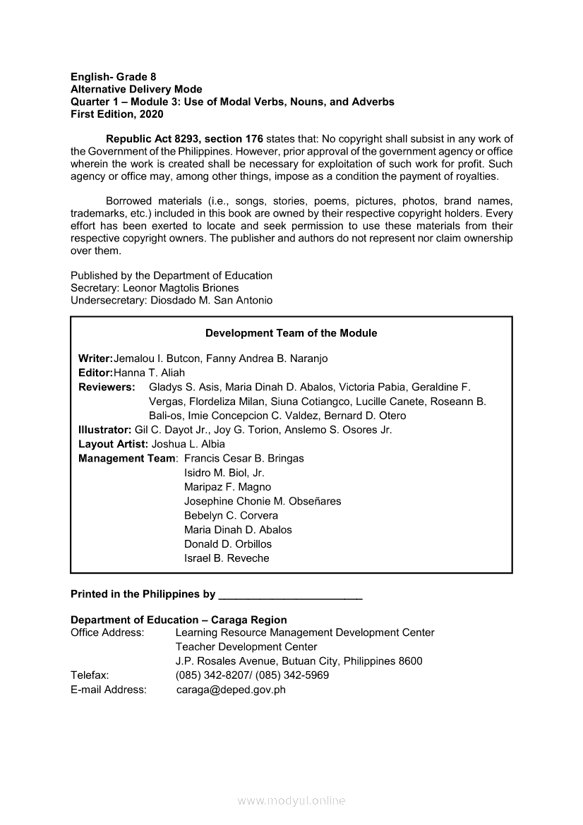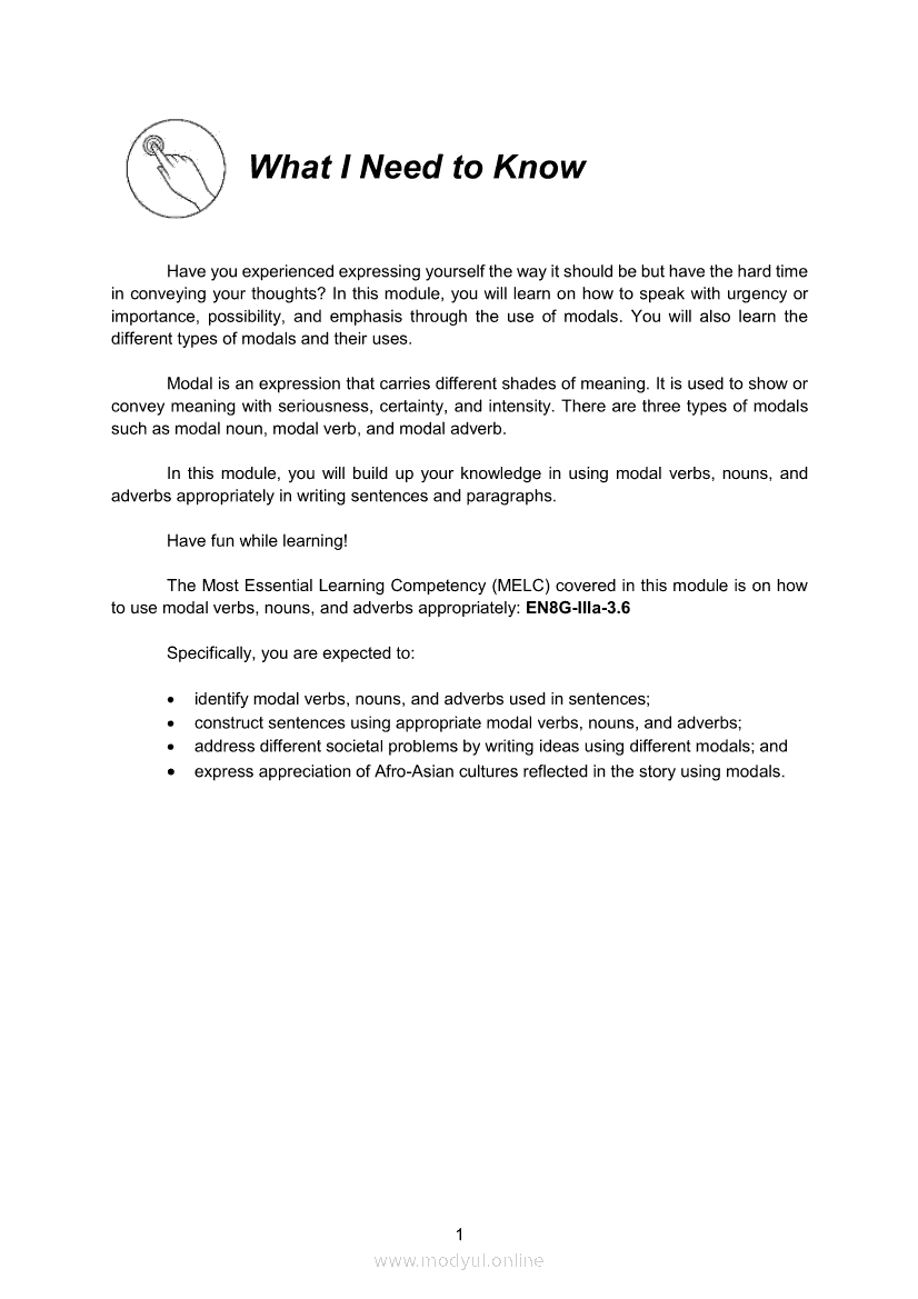 English 8 Module 3: Use of Modal Verbs, Nouns, and AdverbsApr 22, 2021 Grade 8Xiaomi Redmi Watch 5 Active 2inch LCD Display Clear Calling 5ATM Waterproof Smart Watch for only ₱3,999 ₱1,200!. English 8RelatedEnglish Quarter 4 – Module 1b: Using Appropriate Grammatical Signals or Expressions Suitable to Each Pattern of Idea Development: Problem-Solution and Cause-EffectEnglish Quarter 4 – Module 1a: Using Appropriate Grammatical Signals Suitable to Each Pattern of Idea Development: General to Particular and Claim and CounterclaimEnglish 8 Module 5: Expressing Emotional Responses Using a Range of Verbs, Adjectives, and AdverbsEnglish 8 Module 1: Noting Context CluesEnglish 8 Quarter 2 - Module 1: Explaining Visual-Verbal Relationships