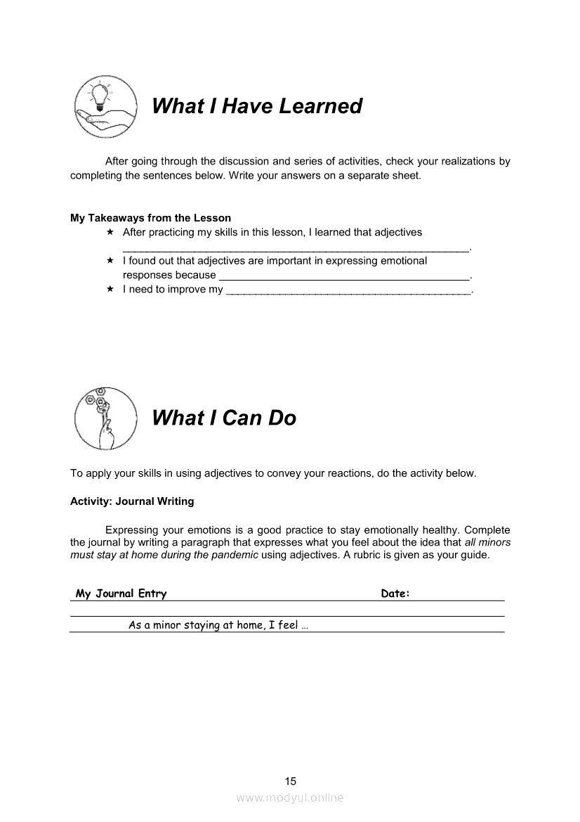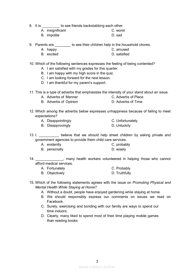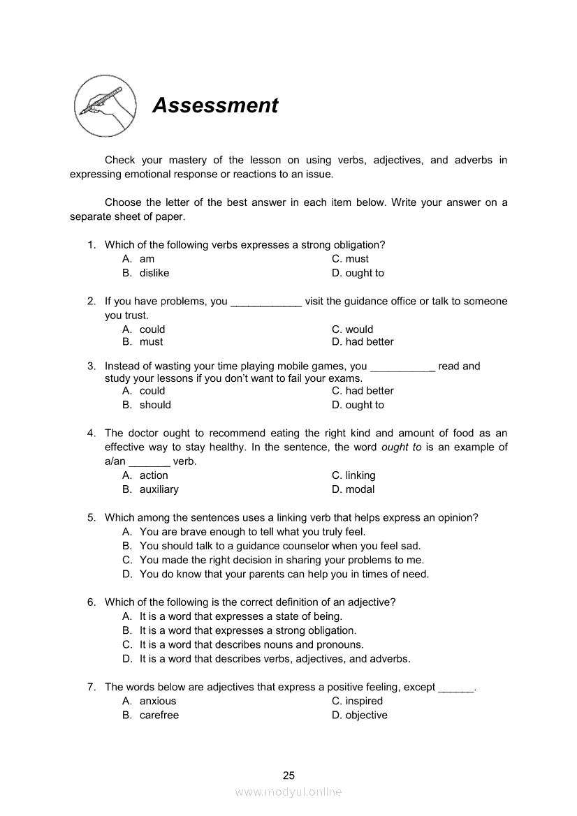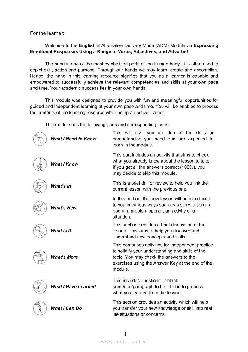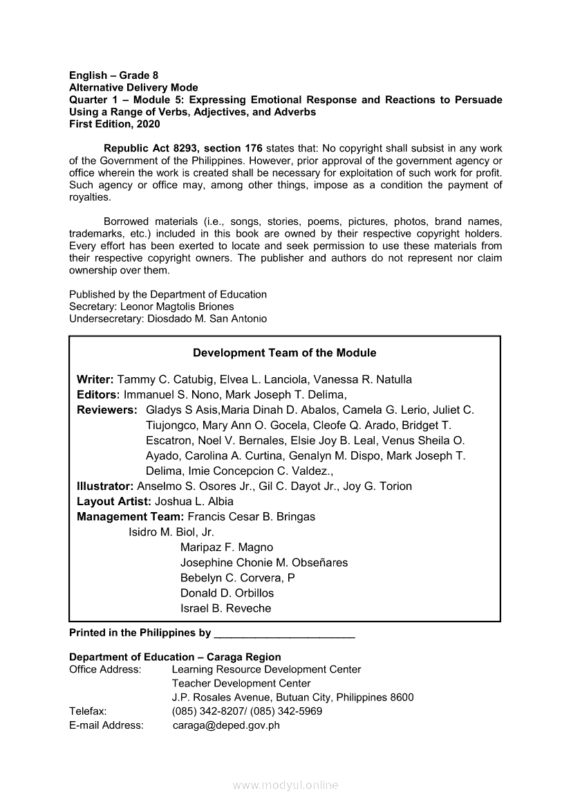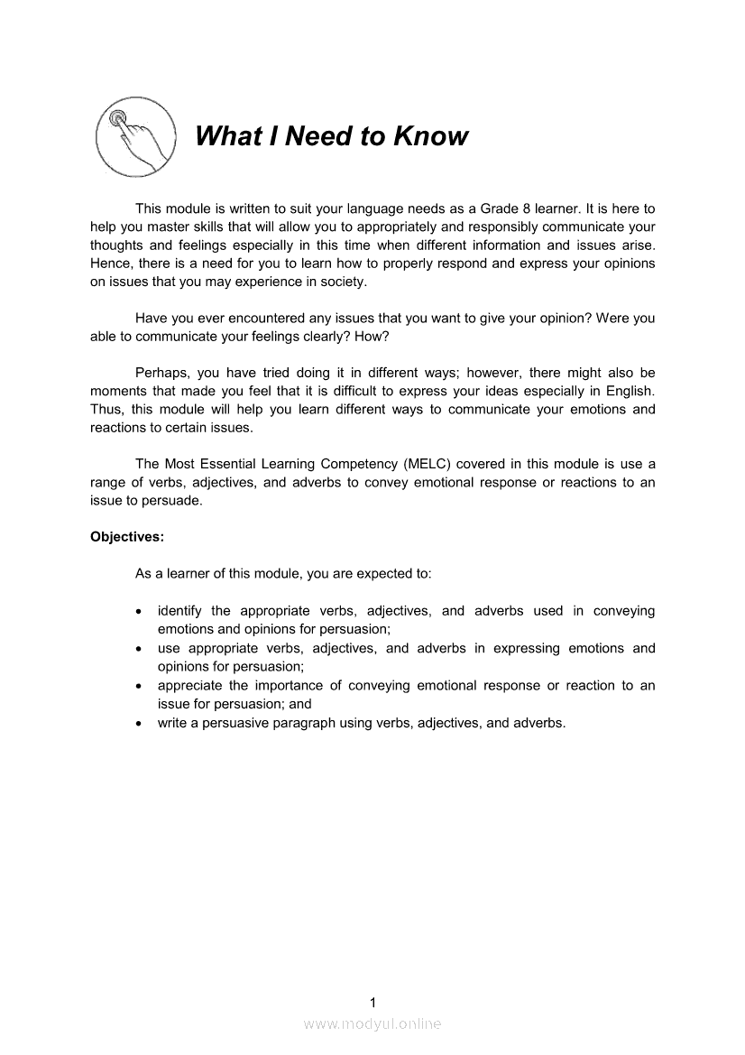 English 8 Module 5: Expressing Emotional Responses Using a Range of Verbs, Adjectives, and AdverbsApr 22, 2021 Grade 8Xiaomi Redmi Watch 5 Active 2inch LCD Display Clear Calling 5ATM Waterproof Smart Watch for only ₱3,999 ₱1,200!. English 8RelatedEnglish Quarter 4 – Module 1a: Using Appropriate Grammatical Signals Suitable to Each Pattern of Idea Development: General to Particular and Claim and CounterclaimEnglish Quarter 4 – Module 1b: Using Appropriate Grammatical Signals or Expressions Suitable to Each Pattern of Idea Development: Problem-Solution and Cause-EffectEnglish 8 Module 1: Noting Context CluesEnglish 8 Module 2: Writing BibliographyEnglish 8 Quarter 2 – Module 3: Compare and Contrast Same Topic in Different Multimodal Texts