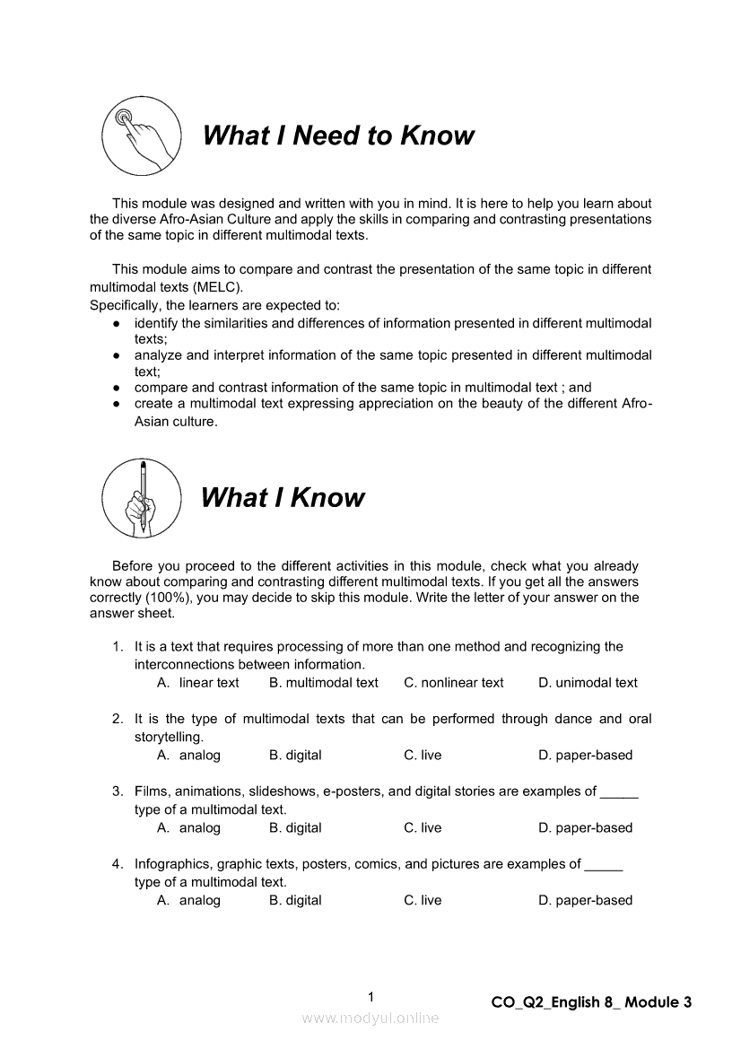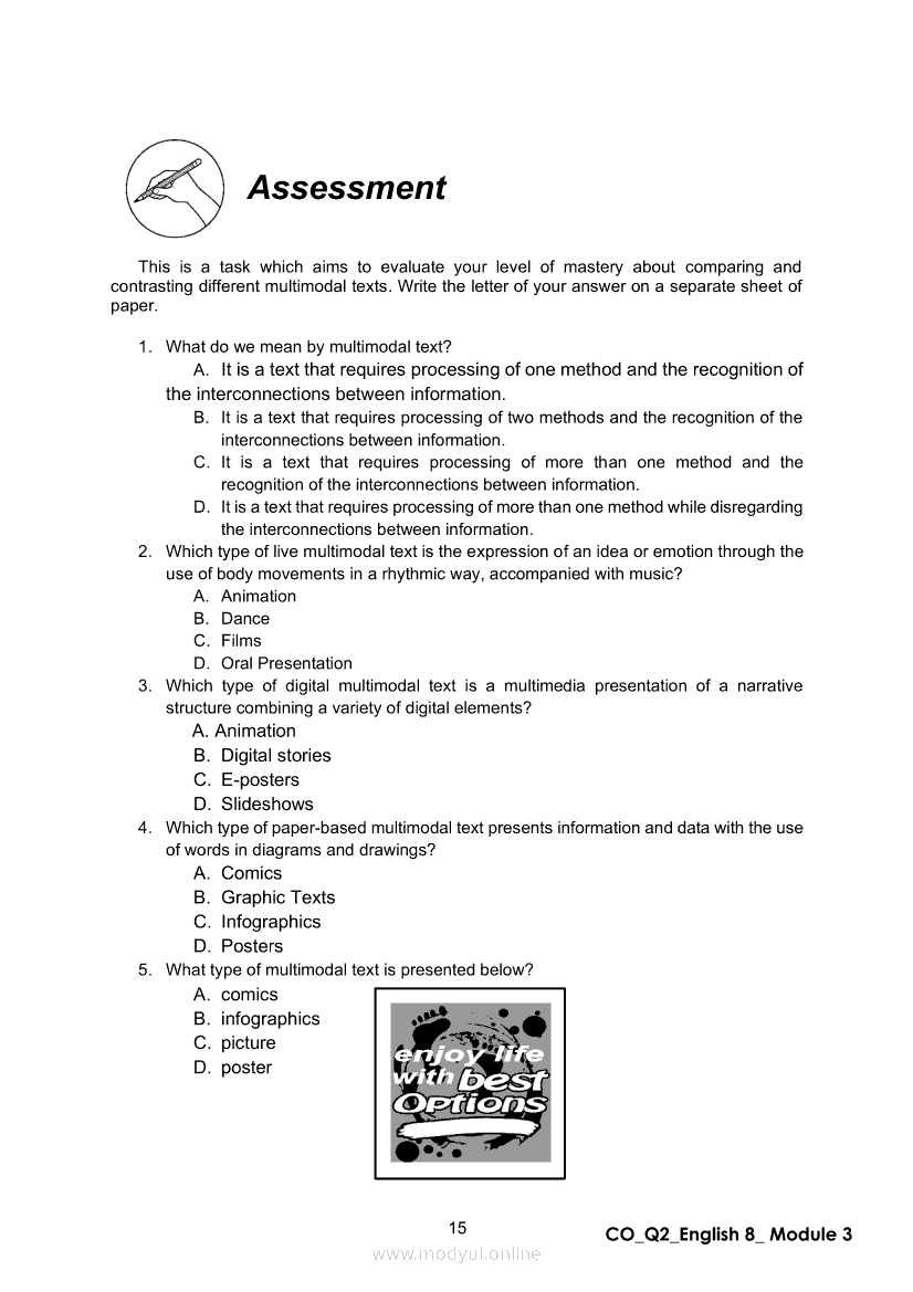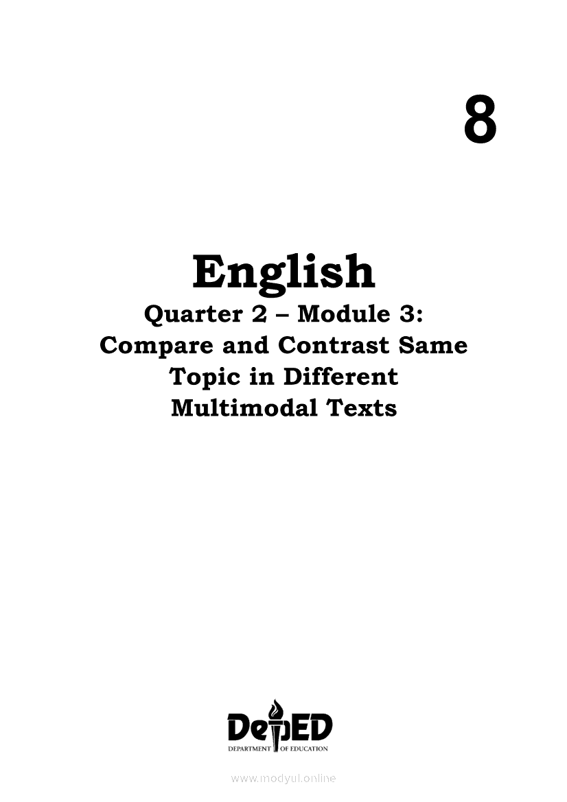 English 8 Quarter 2 – Module 3: Compare and Contrast Same Topic in Different Multimodal TextsApr 22, 2021 Grade 8Xiaomi Redmi Watch 5 Active 2inch LCD Display Clear Calling 5ATM Waterproof Smart Watch for only ₱3,999 ₱1,200!. English 8RelatedEnglish Quarter 4 – Module 1b: Using Appropriate Grammatical Signals or Expressions Suitable to Each Pattern of Idea Development: Problem-Solution and Cause-EffectEnglish Quarter 4 – Module 1a: Using Appropriate Grammatical Signals Suitable to Each Pattern of Idea Development: General to Particular and Claim and CounterclaimEnglish 8 Second Quarter Module (PIVOT)English 8 Module 3: Use of Modal Verbs, Nouns, and AdverbsEnglish 8 Module 1: Noting Context Clues