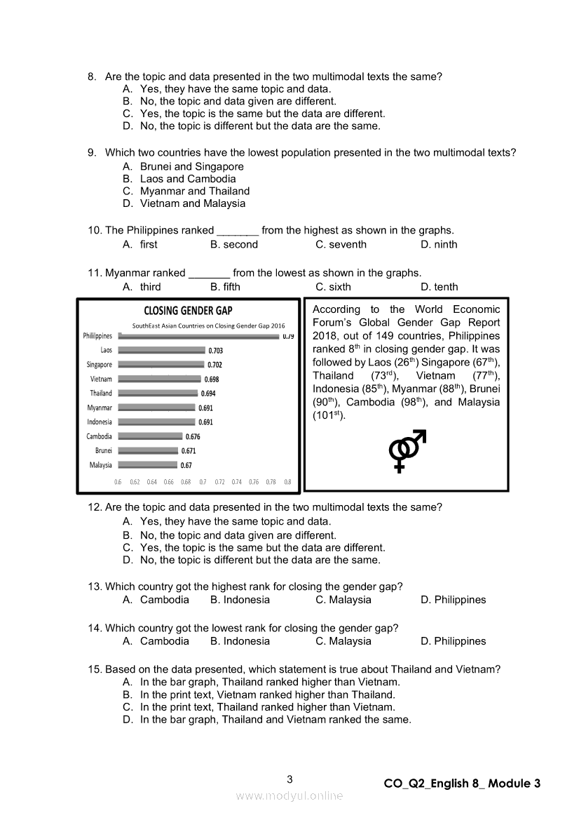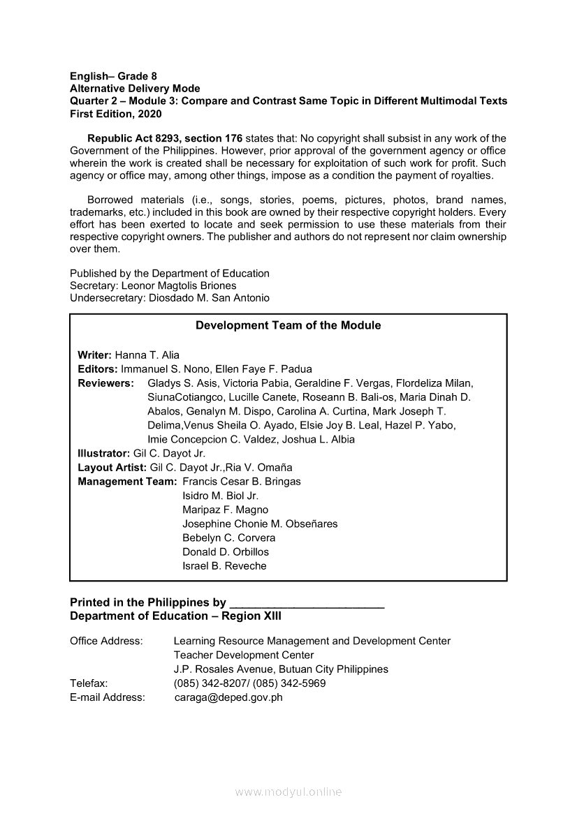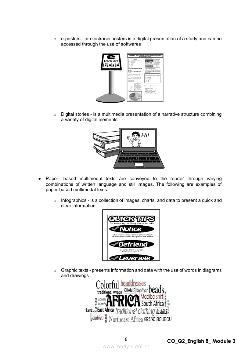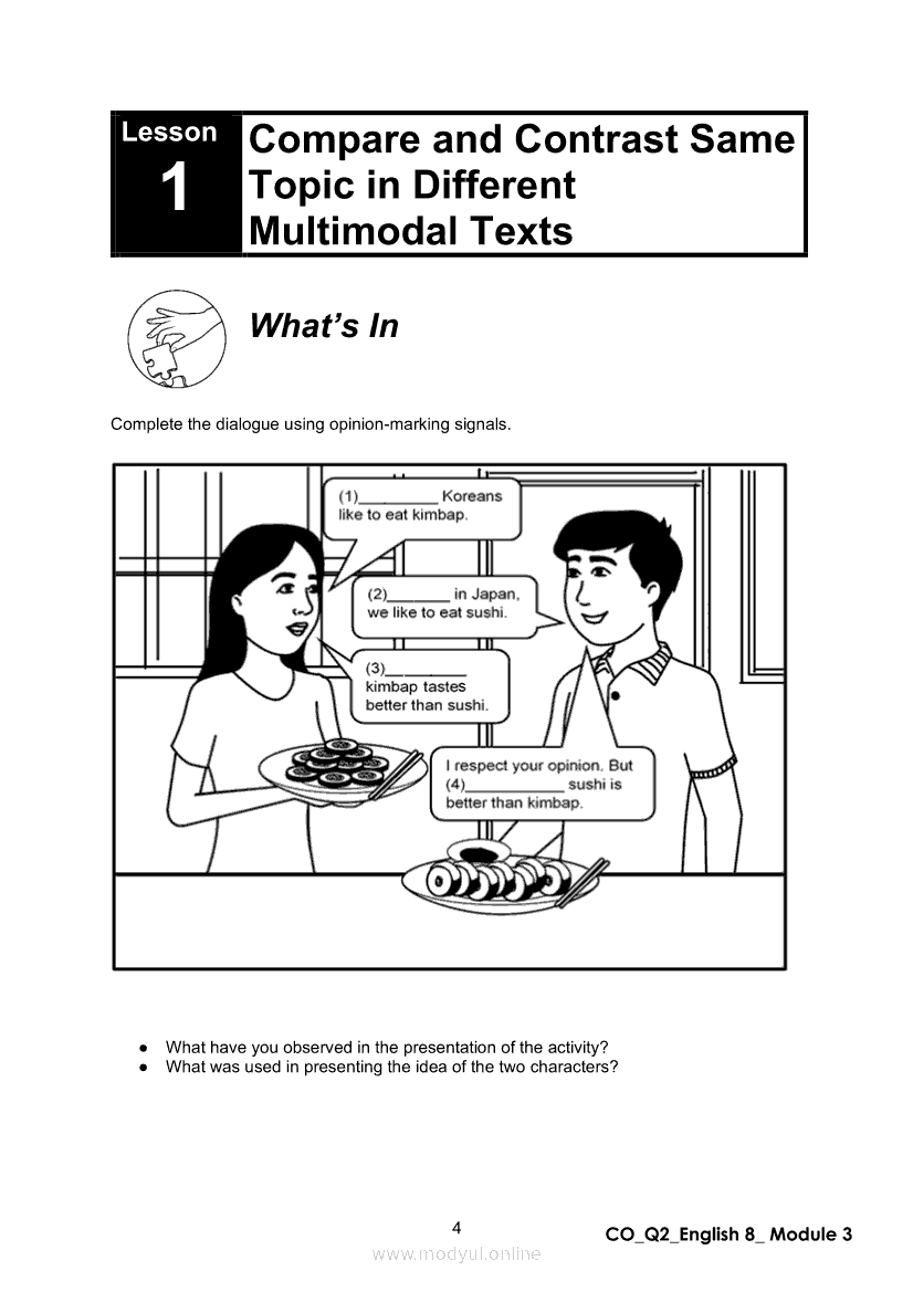 English 8 Quarter 2 – Module 3: Compare and Contrast Same Topic in Different Multimodal TextsApr 22, 2021 Grade 8Xiaomi Redmi Watch 5 Active 2inch LCD Display Clear Calling 5ATM Waterproof Smart Watch for only ₱3,999 ₱1,200!. English 8RelatedEnglish Quarter 4 – Module 1b: Using Appropriate Grammatical Signals or Expressions Suitable to Each Pattern of Idea Development: Problem-Solution and Cause-EffectEnglish Quarter 4 – Module 1a: Using Appropriate Grammatical Signals Suitable to Each Pattern of Idea Development: General to Particular and Claim and CounterclaimEnglish 8 Second Quarter Module (PIVOT)English 8 Module 3: Use of Modal Verbs, Nouns, and AdverbsEnglish 8 Module 1: Noting Context Clues