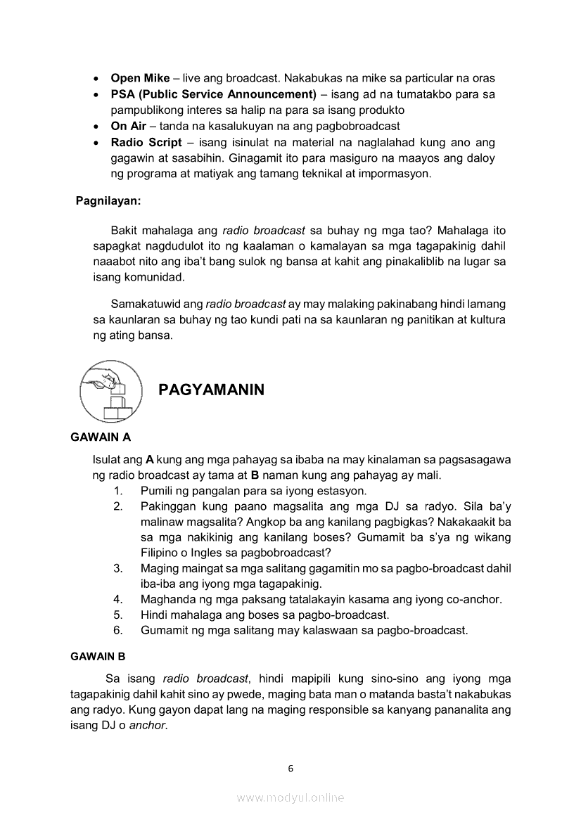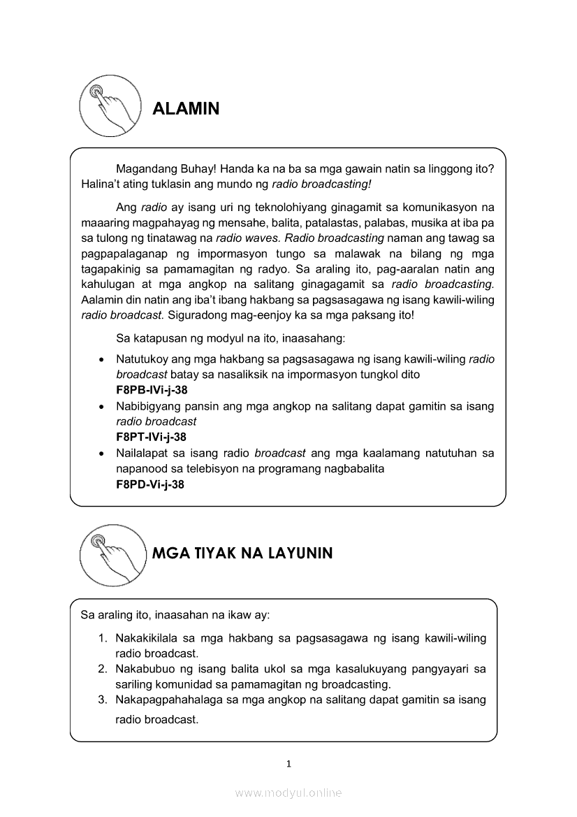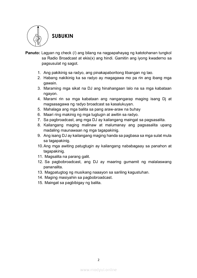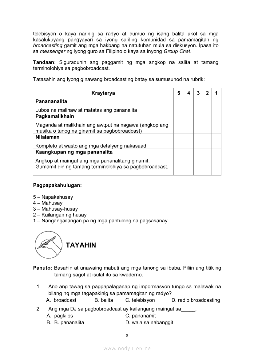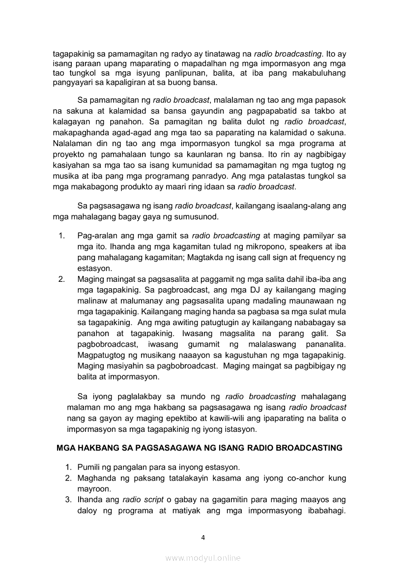 Filipino 8 Ika-apat na Markahan–Modyul 7 Mga Hakbang Sa Pagsasagawa Ng Isang Kawili-wiling Radio BroadcastMay 27, 2021 Grade 8Xiaomi Redmi Watch 5 Active 2inch LCD Display Clear Calling 5ATM Waterproof Smart Watch for only ₱3,999 ₱1,200!. Filipino 8 4th QuarterRelatedFilipino 8 Ikaapat na Markahan –Modyul 2 FLORANTE AT LAURA Paglalahad ng Damdamin, Saloobin Pangyayari at Pagsusuri ng KaisipanFilipino 8 Ikaapat na Markahan –Modyul 1 FLORANTE AT LAURA Talambuhay ni Balagtas at Kaligirang Kasaysayan ng AkdaMATHEMATICS Quarter 4 – Module 7 Probabilities of Simple EventsEdukasyon sa Pagpapakatao Ikaapat na Markahan – Modyul 13.A Ang Seksuwalidad ng Tao (Linggo: Ikatlo)MUSIC Quarter 4 – Module 4b Traditional Asian Theater Music