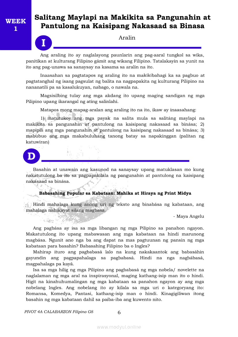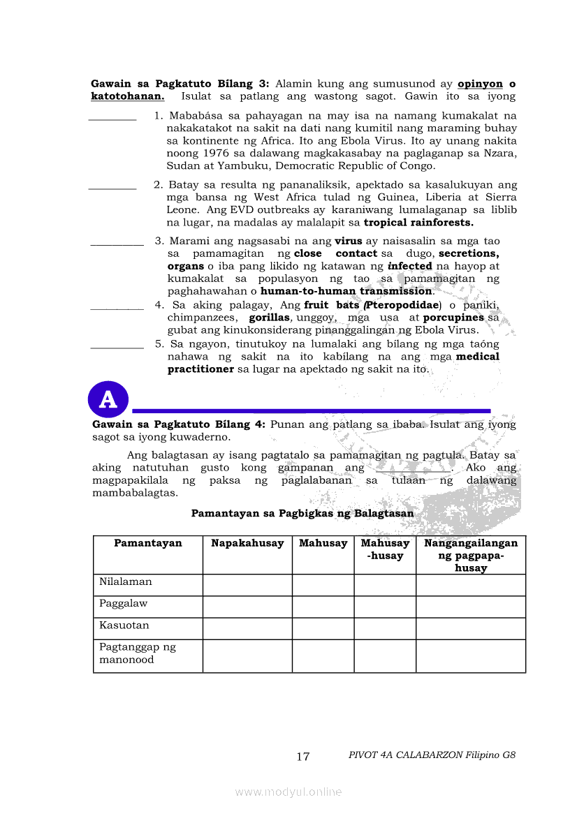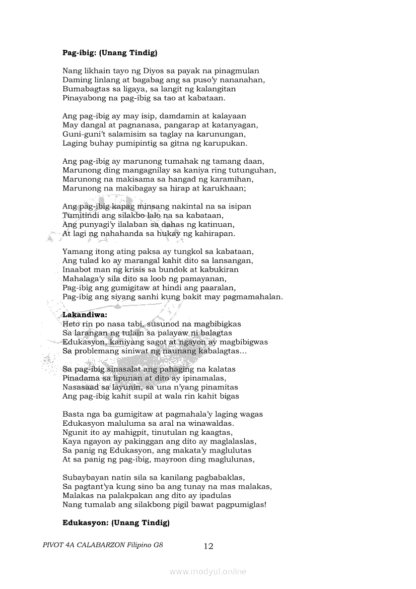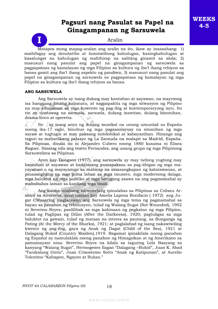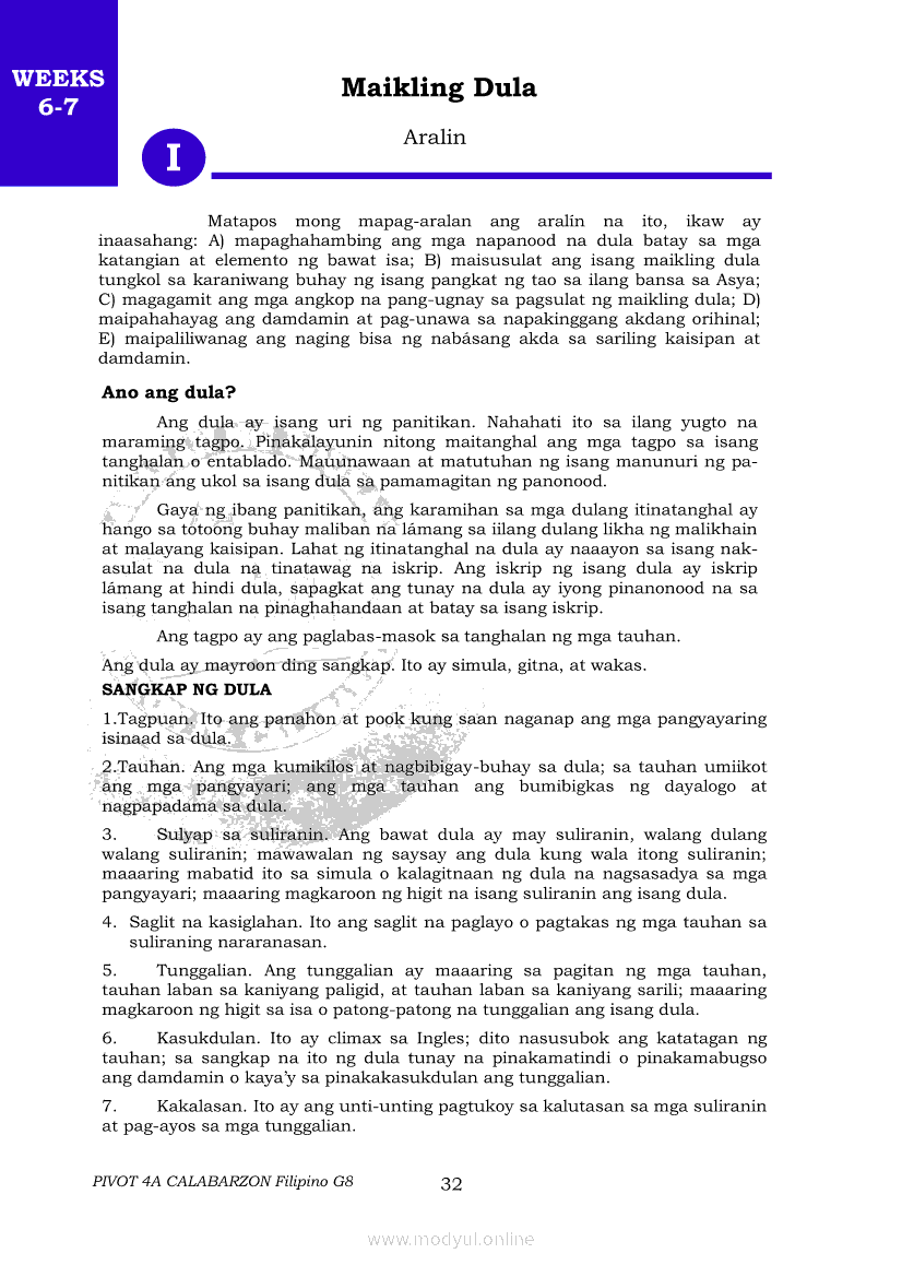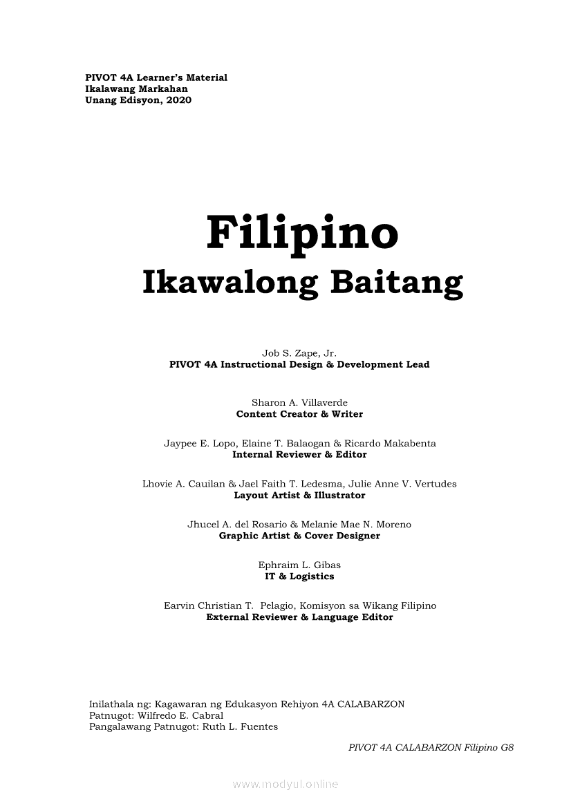 Filipino 8 Modyul para sa Ikalawang Markahan (PIVOT)Apr 22, 2021 Grade 8Xiaomi Redmi Watch 5 Active 2inch LCD Display Clear Calling 5ATM Waterproof Smart Watch for only ₱3,999 ₱1,200!. Filipino 8RelatedFilipino 8 Ika-apat na Markahan–Modyul 7 Mga Hakbang Sa Pagsasagawa Ng Isang Kawili-wiling Radio BroadcastFilipino 8 Ikaapat na Markahan –Modyul 1 FLORANTE AT LAURA Talambuhay ni Balagtas at Kaligirang Kasaysayan ng AkdaFilipino 8 Ikaapat na Markahan –Modyul 2 FLORANTE AT LAURA Paglalahad ng Damdamin, Saloobin Pangyayari at Pagsusuri ng KaisipanFilipino 8 Modyul 2: Matatalinghagang Pahayag at Eupemistiko o Masining na PahayagFilipino 8 Modyul 1: Karunungang Bayan