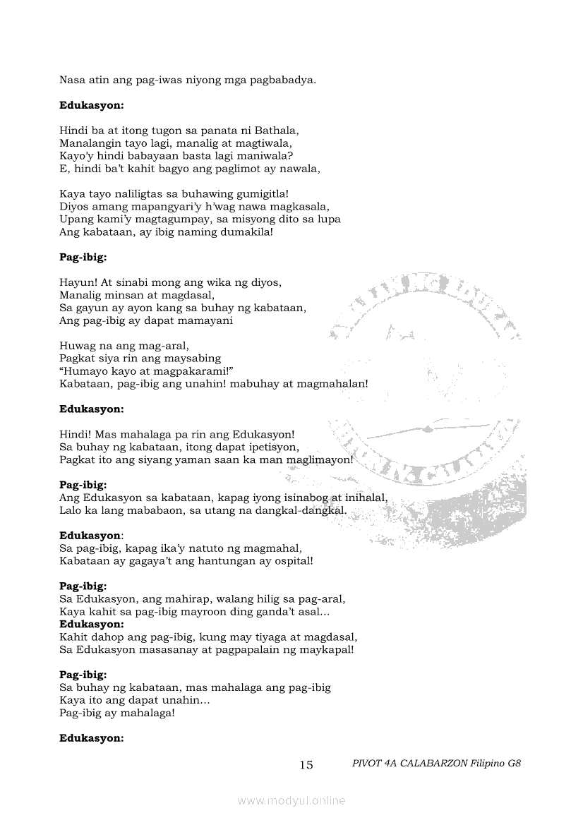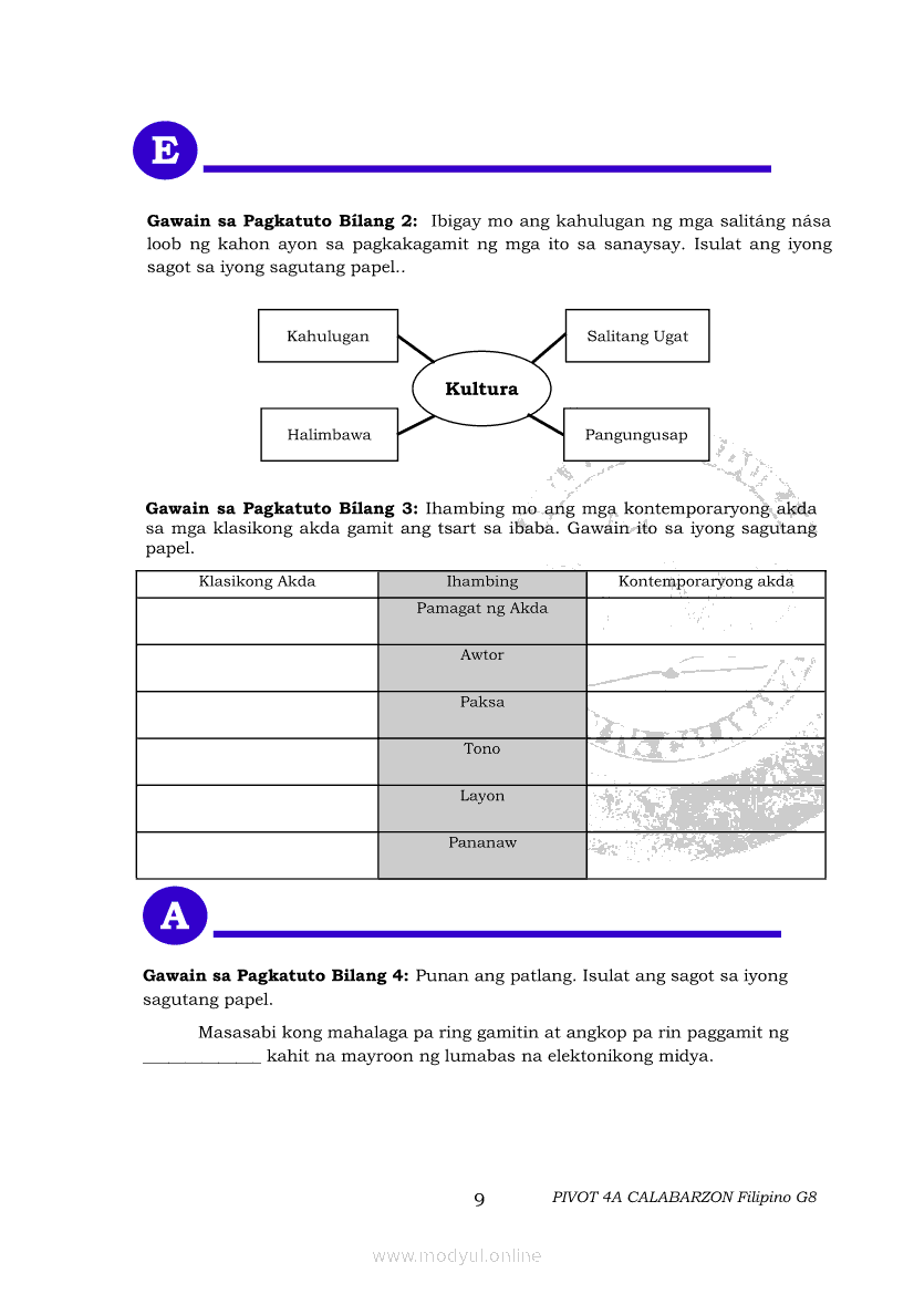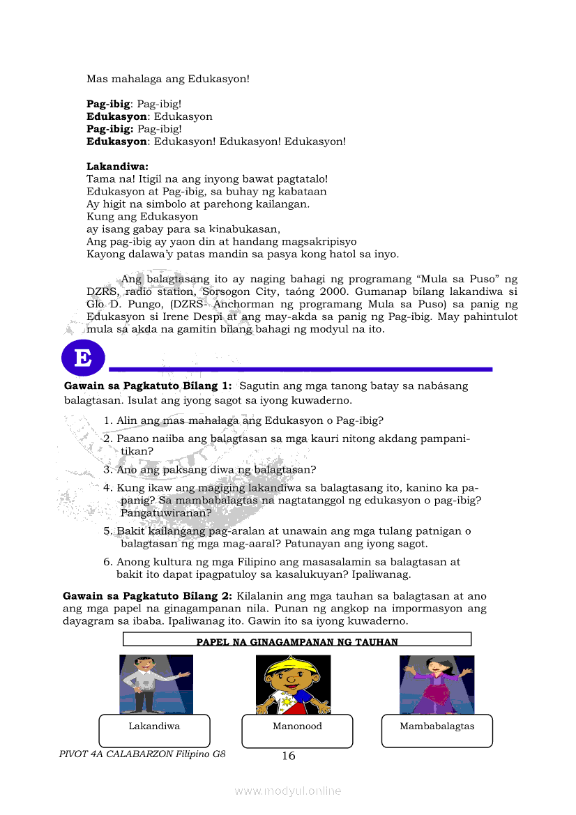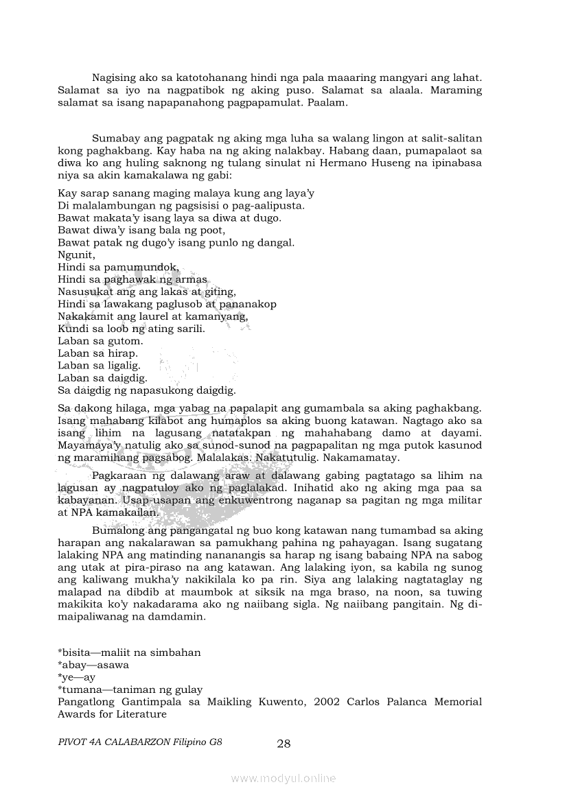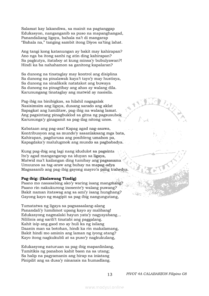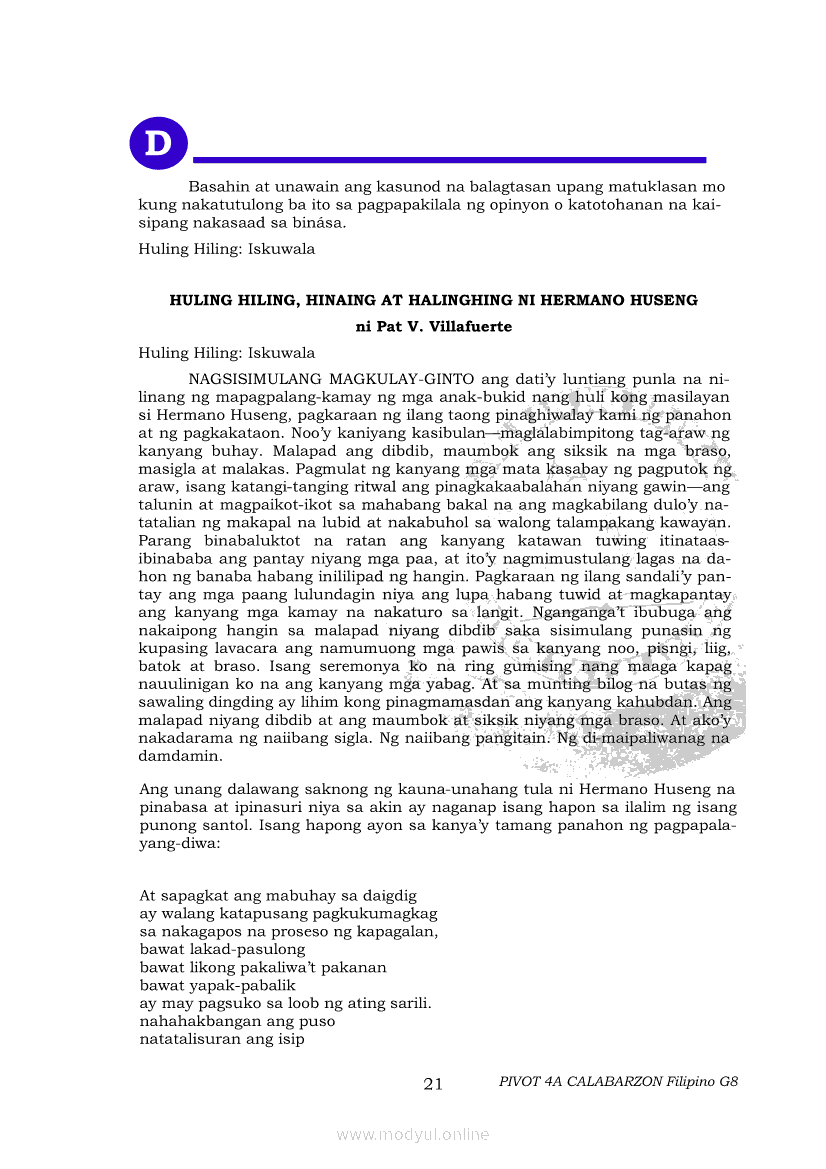 Filipino 8 Modyul para sa Ikalawang Markahan (PIVOT)Apr 22, 2021 Grade 8Xiaomi Redmi Watch 5 Active 2inch LCD Display Clear Calling 5ATM Waterproof Smart Watch for only ₱3,999 ₱1,200!. Filipino 8RelatedFilipino 8 Ika-apat na Markahan–Modyul 7 Mga Hakbang Sa Pagsasagawa Ng Isang Kawili-wiling Radio BroadcastFilipino 8 Ikaapat na Markahan –Modyul 1 FLORANTE AT LAURA Talambuhay ni Balagtas at Kaligirang Kasaysayan ng AkdaFilipino 8 Ikaapat na Markahan –Modyul 2 FLORANTE AT LAURA Paglalahad ng Damdamin, Saloobin Pangyayari at Pagsusuri ng KaisipanFilipino 8 Modyul 2: Matatalinghagang Pahayag at Eupemistiko o Masining na PahayagFilipino 8 Modyul 1: Karunungang Bayan