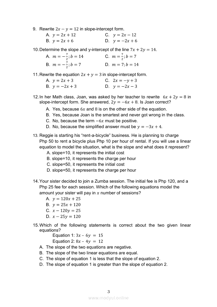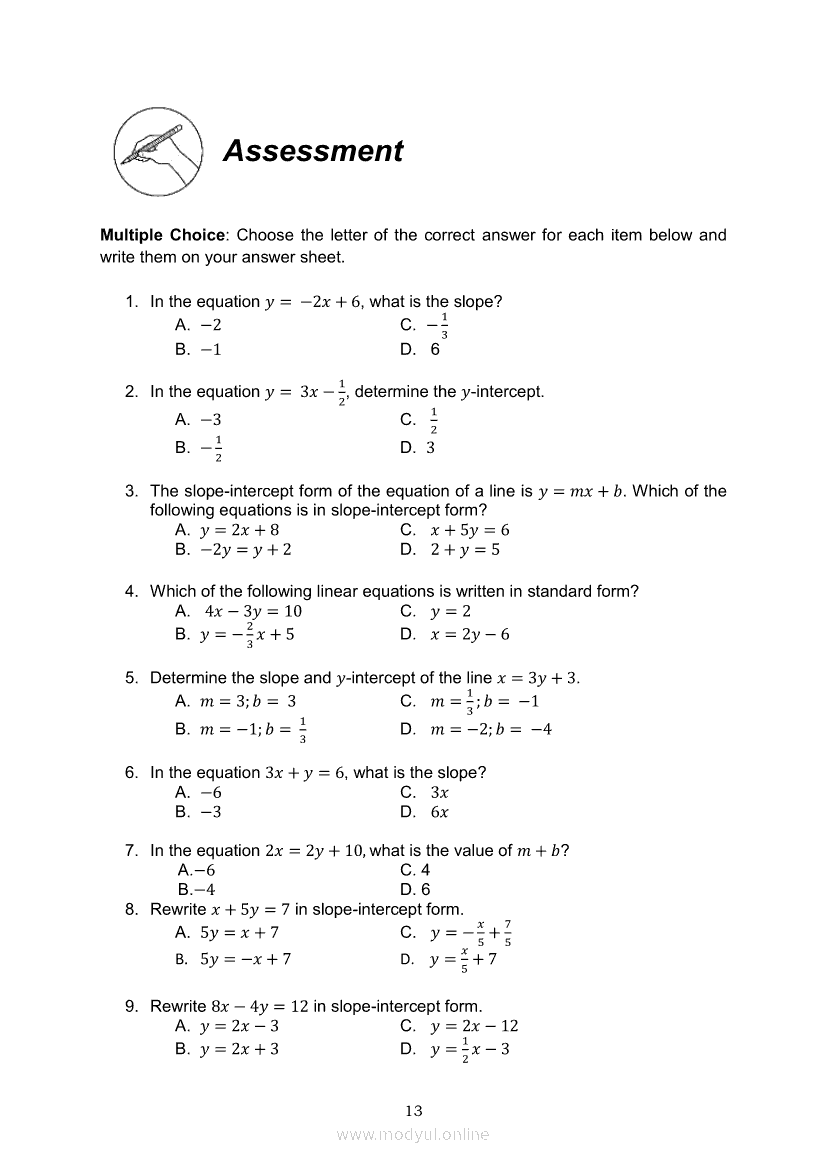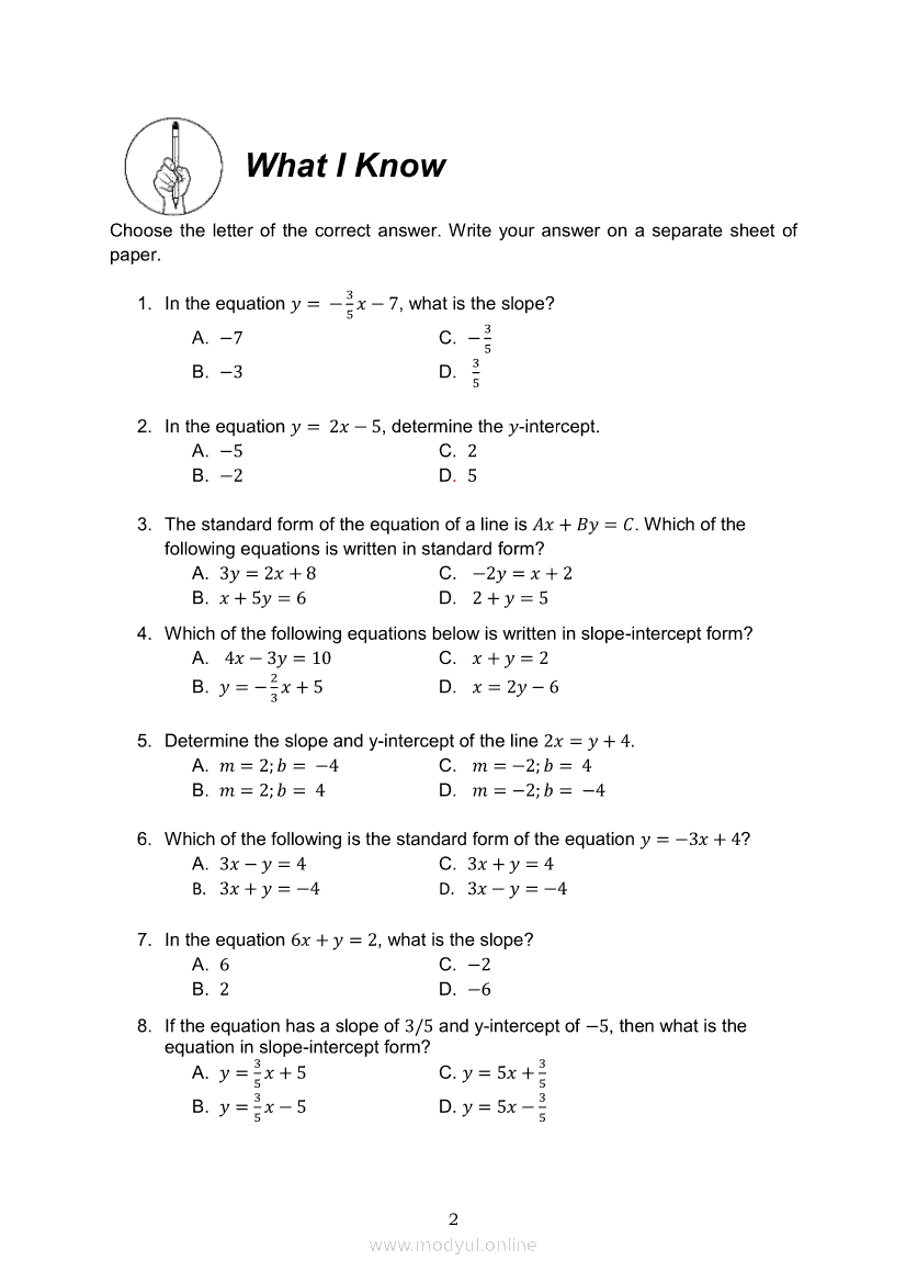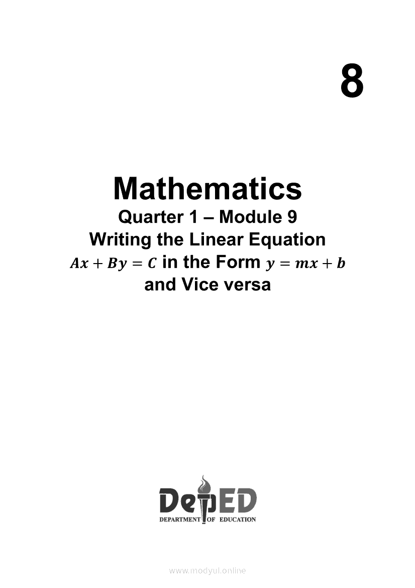 Math 8 Module 9: Writing the Linear Equation 𝑨𝒙 + 𝑩𝒚 = 𝑪 in the Form 𝒚 = 𝒎𝒙 + 𝒃 and Vice versaApr 22, 2021 Grade 8Xiaomi Redmi Watch 5 Active 2inch LCD Display Clear Calling 5ATM Waterproof Smart Watch for only ₱3,999 ₱1,200!. Math 8RelatedMATHEMATICS Quarter 4 – Module 6 Basic Concepts of ProbabilityMATHEMATICS Quarter 4 – Module 8 Probability of an Event Experimental and TheoreticalMATHEMATICS Quarter 4 - Module 3 Proving Inequalities in a TriangleMATHEMATICS Quarter 4 – Module 1 Inequalities in TrianglesMATHEMATICS Quarter 4 – Module 2 Theorems on Triangle Inequalities