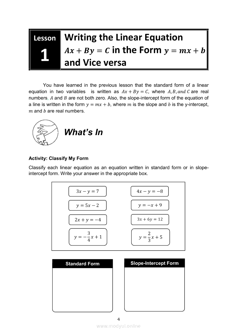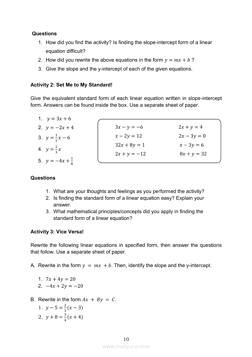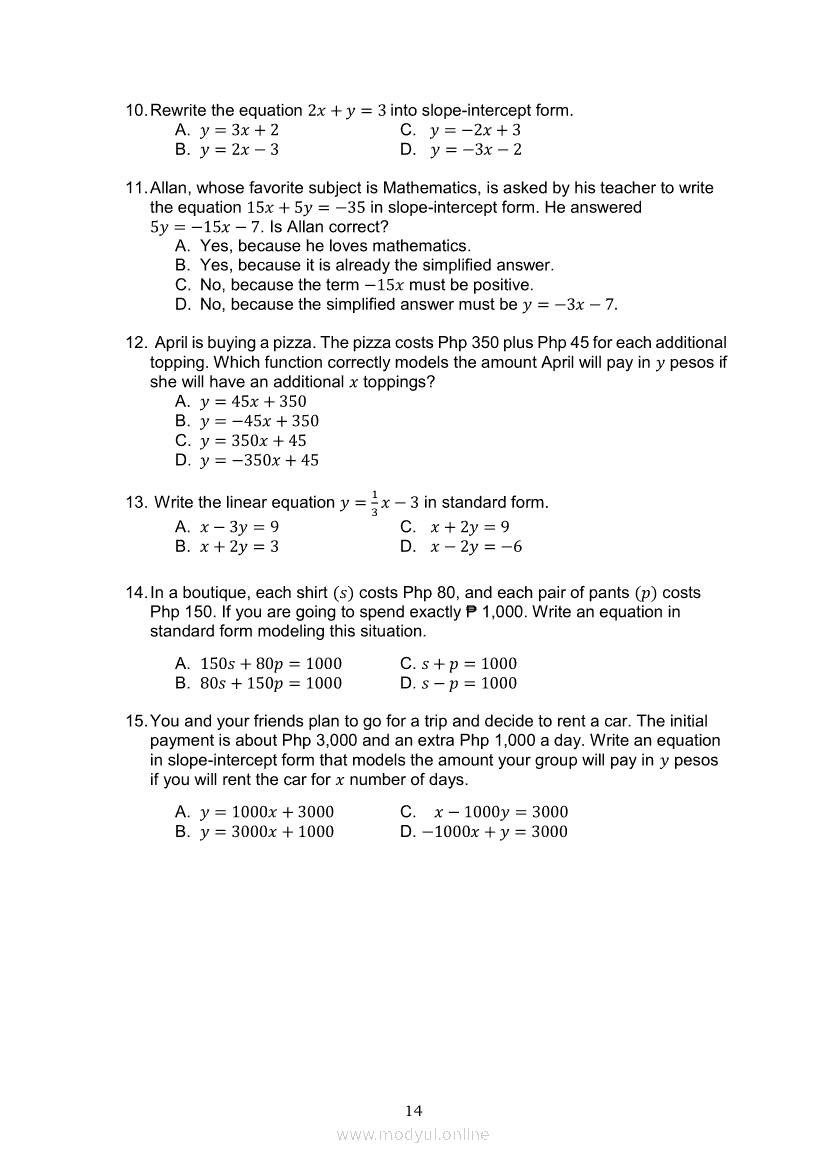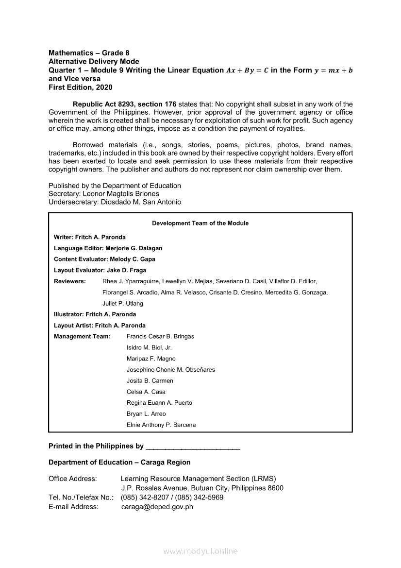 Math 8 Module 9: Writing the Linear Equation 𝑨𝒙 + 𝑩𝒚 = 𝑪 in the Form 𝒚 = 𝒎𝒙 + 𝒃 and Vice versaApr 22, 2021 Grade 8Xiaomi Redmi Watch 5 Active 2inch LCD Display Clear Calling 5ATM Waterproof Smart Watch for only ₱3,999 ₱1,200!. Math 8RelatedMATHEMATICS Quarter 4 – Module 6 Basic Concepts of ProbabilityMATHEMATICS Quarter 4 – Module 8 Probability of an Event Experimental and TheoreticalMATHEMATICS Quarter 4 - Module 3 Proving Inequalities in a TriangleMATHEMATICS Quarter 4 – Module 1 Inequalities in TrianglesMATHEMATICS Quarter 4 – Module 2 Theorems on Triangle Inequalities