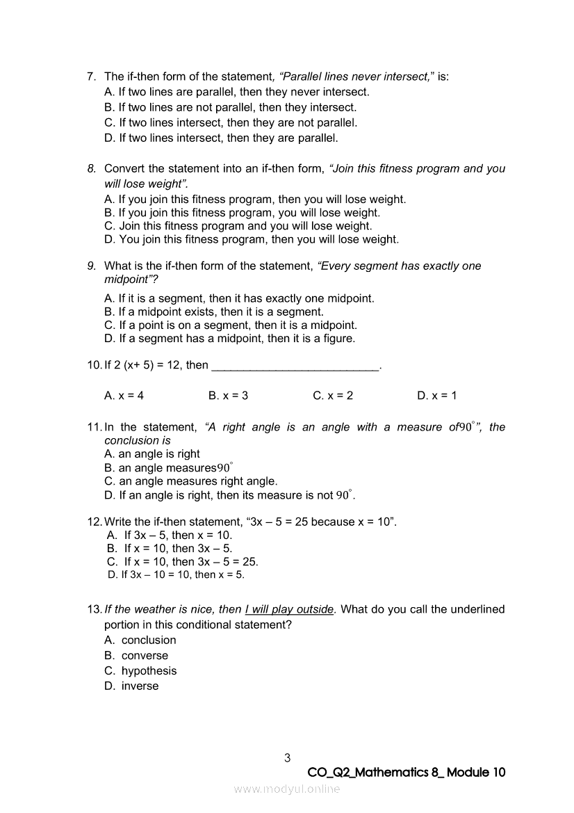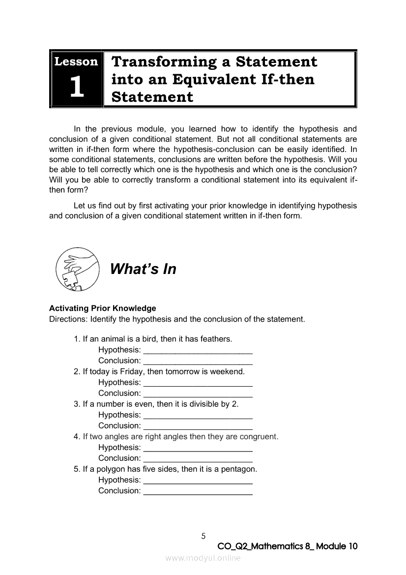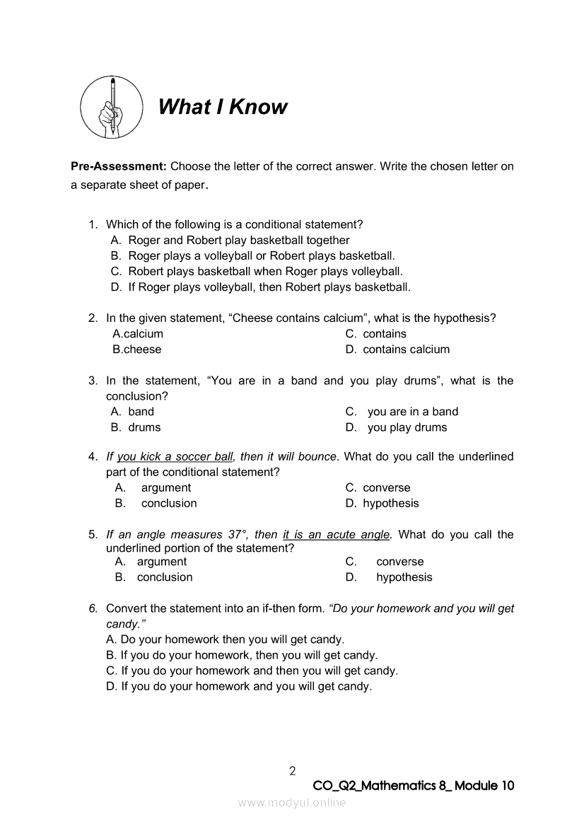 Math 8 Quarter 2 – Module 10: Transforming a Statement into an Equivalent If-then StatementApr 22, 2021 Grade 8Xiaomi Redmi Watch 5 Active 2inch LCD Display Clear Calling 5ATM Waterproof Smart Watch for only ₱3,999 ₱1,200!. Math 8RelatedMATHEMATICS Quarter 4 – Module 1 Inequalities in TrianglesMATHEMATICS Quarter 4 - Module 3 Proving Inequalities in a TriangleMATHEMATICS Quarter 4 – Module 8 Probability of an Event Experimental and TheoreticalMATHEMATICS Quarter 4 – Module 2 Theorems on Triangle InequalitiesMATHEMATICS Quarter 4 – Module 7 Probabilities of Simple Events