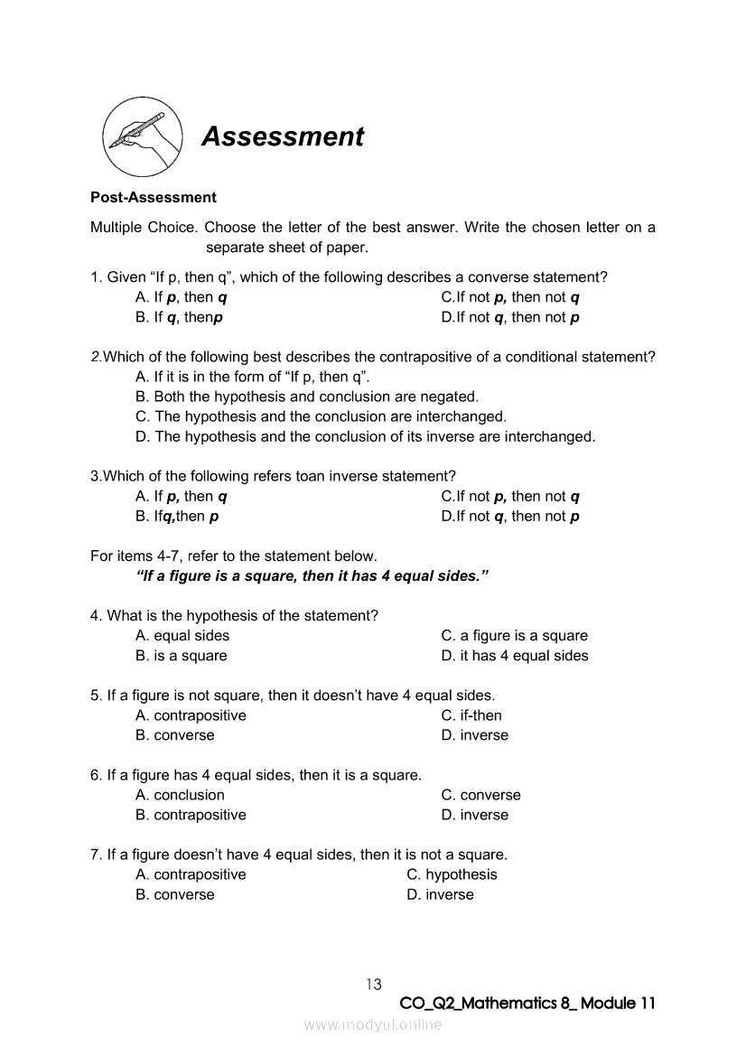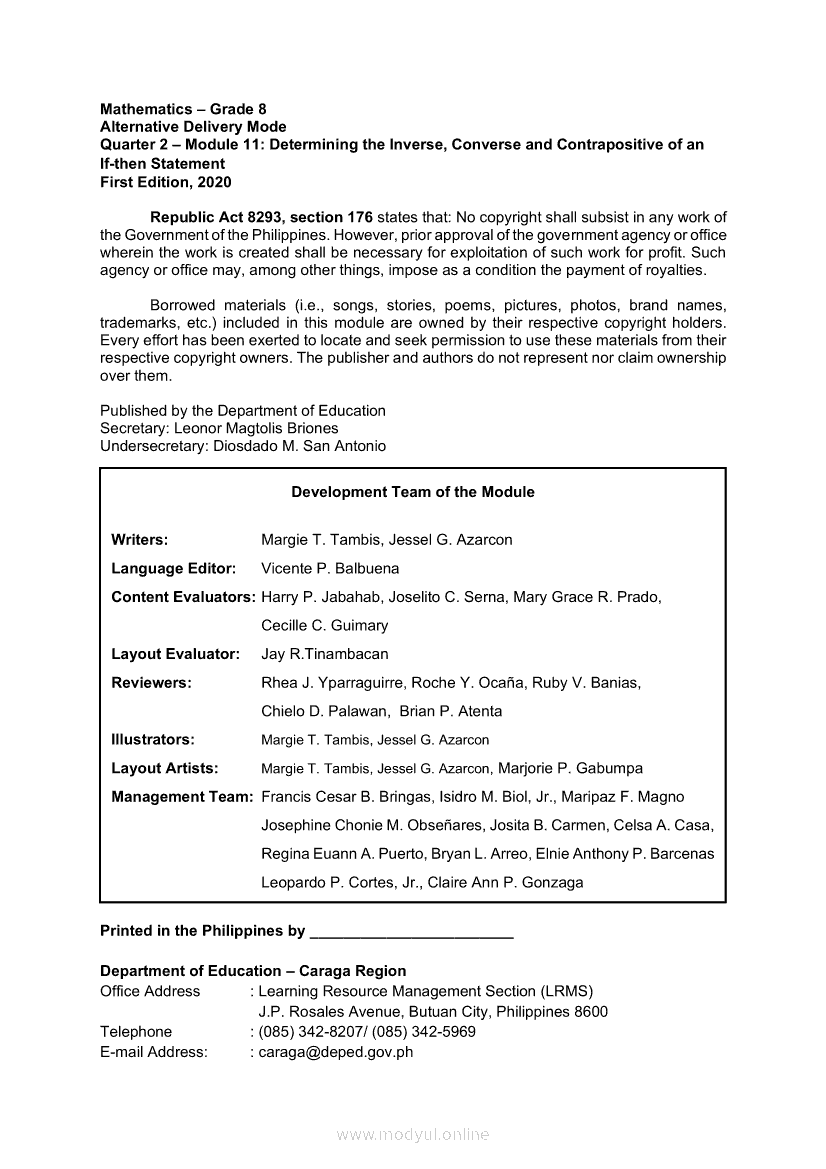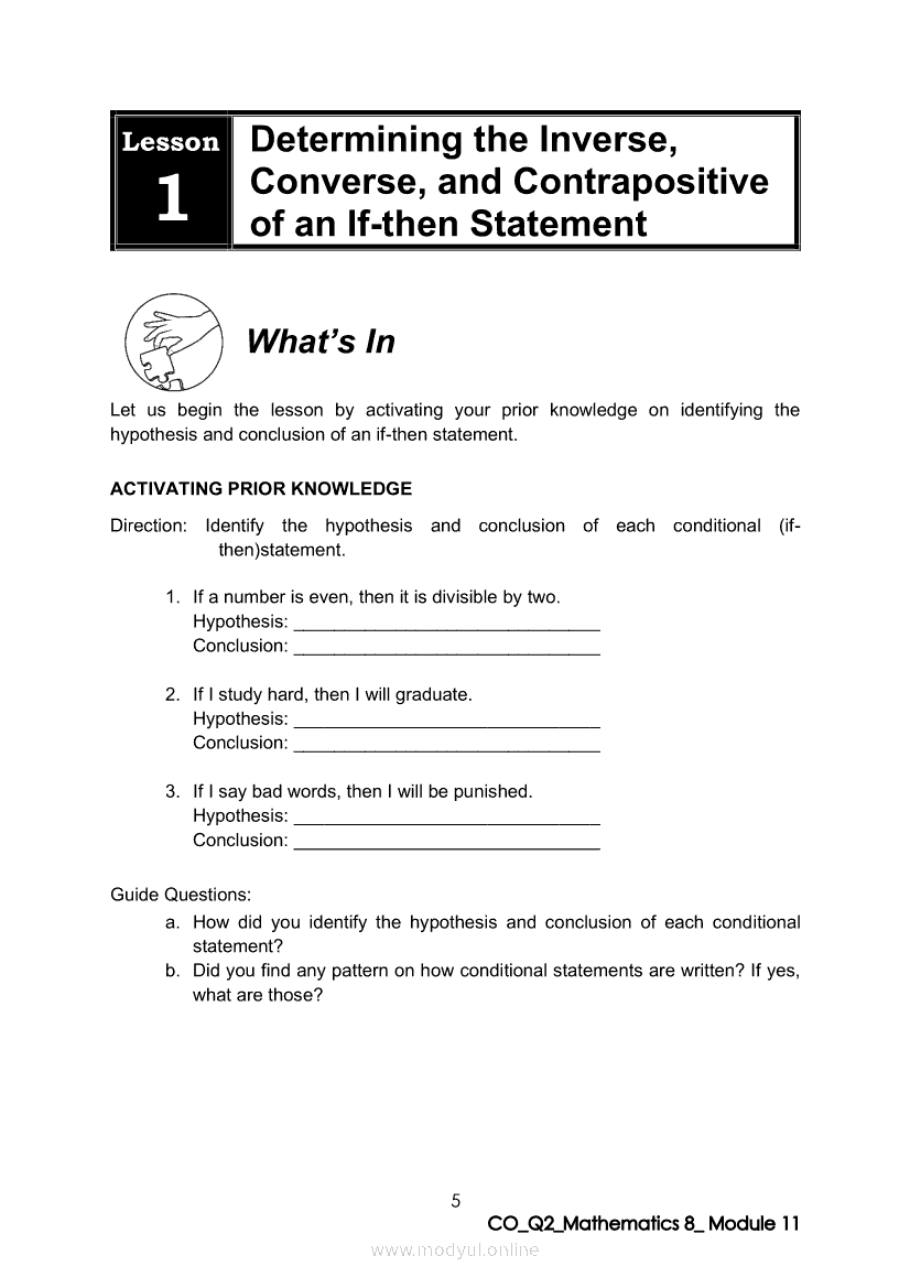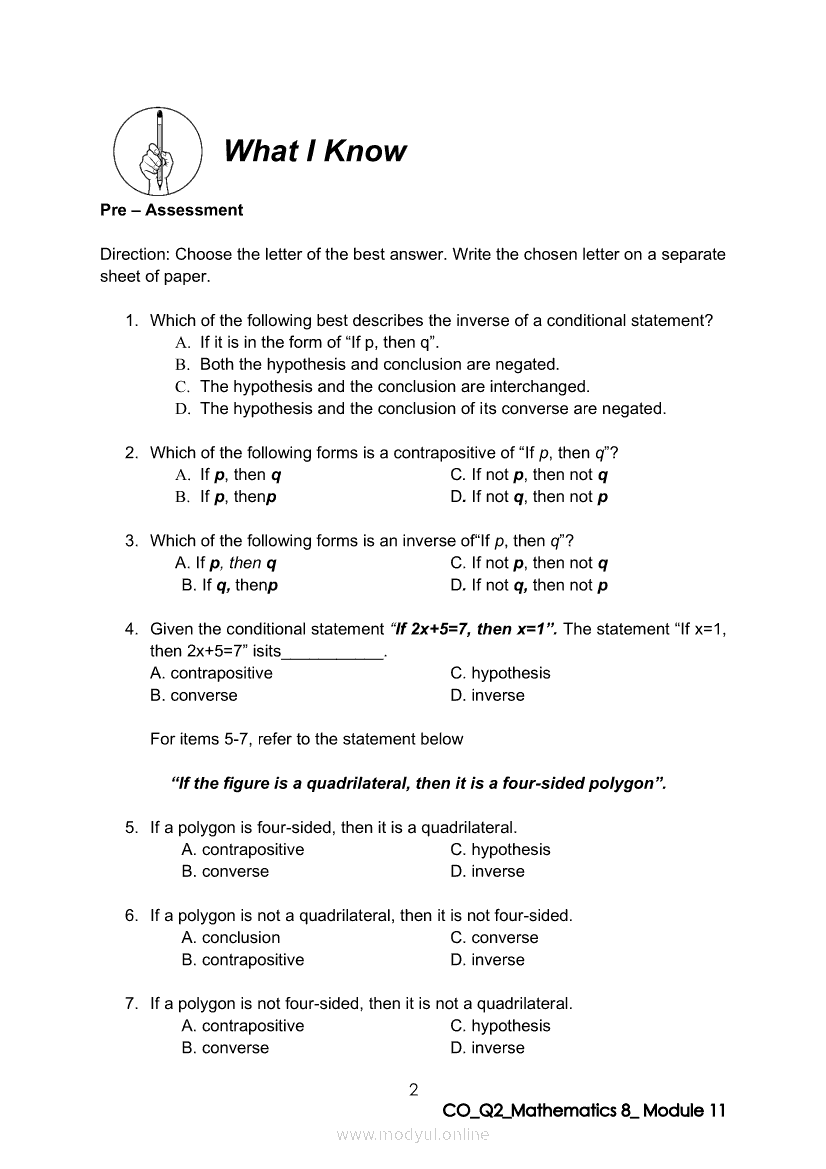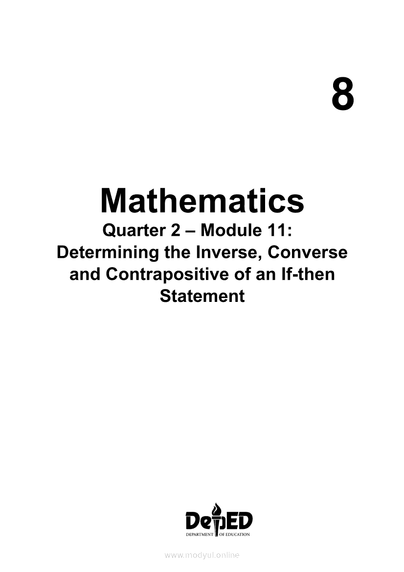 Math 8 Quarter 2 – Module 11: Determining the Inverse, Converse and Contrapositive of an If-then StatementApr 22, 2021 Grade 8Xiaomi Redmi Watch 5 Active 2inch LCD Display Clear Calling 5ATM Waterproof Smart Watch for only ₱3,999 ₱1,200!. Math 8RelatedMATHEMATICS Quarter 4 – Module 4 Properties of Parallel Lines Cut by a TransversalMATHEMATICS Quarter 4 – Module 2 Theorems on Triangle InequalitiesMATHEMATICS Quarter 4 - Module 5 Parallel Lines and Perpendicular LinesMATHEMATICS Quarter 4 - Module 3 Proving Inequalities in a TriangleMATHEMATICS Quarter 4 – Module 1 Inequalities in Triangles