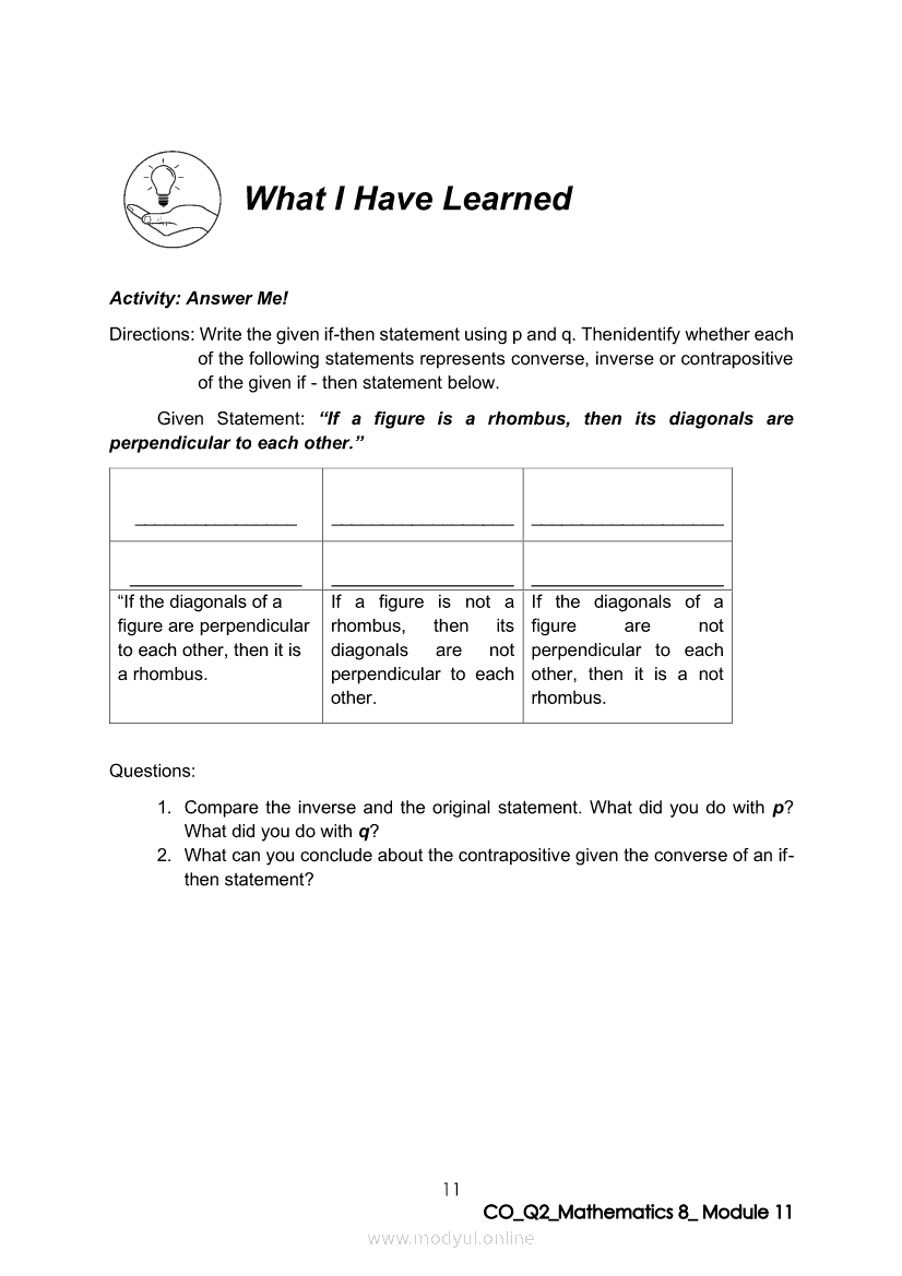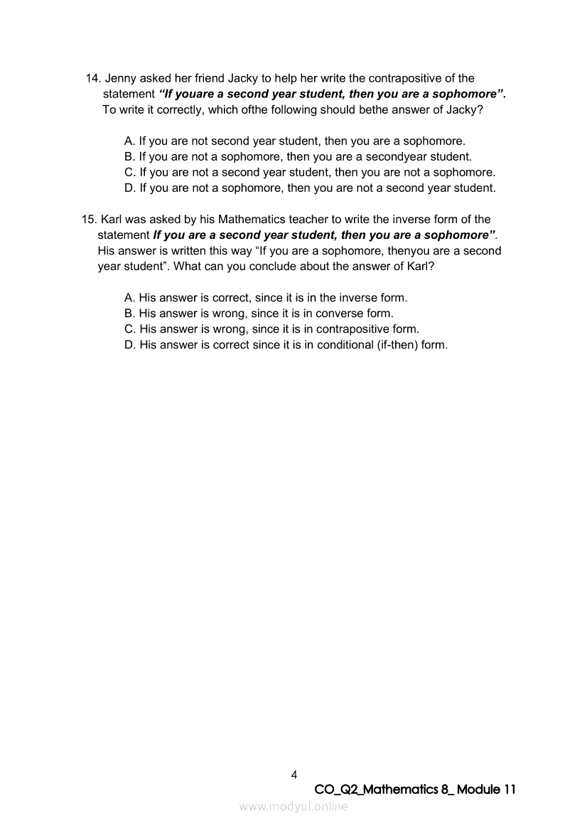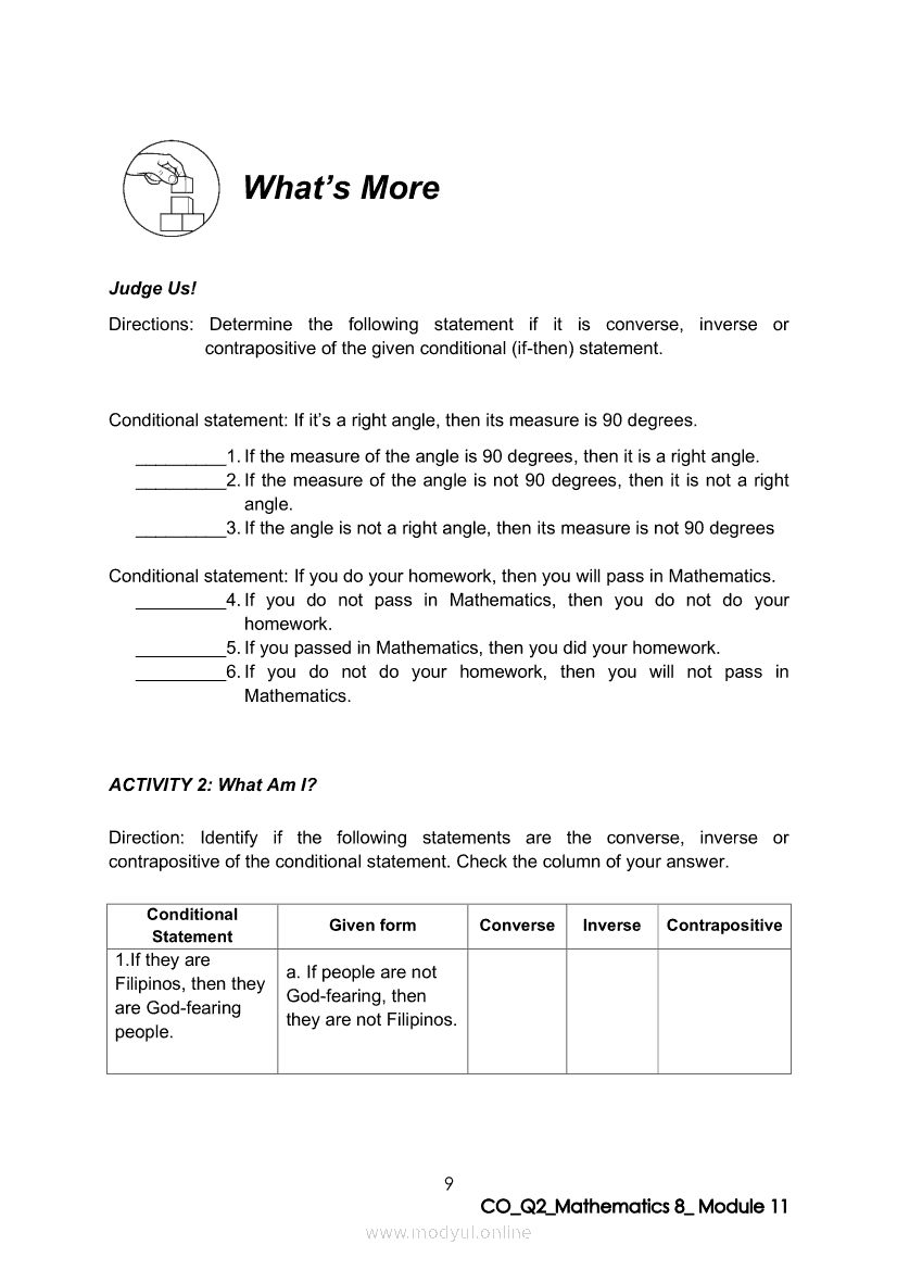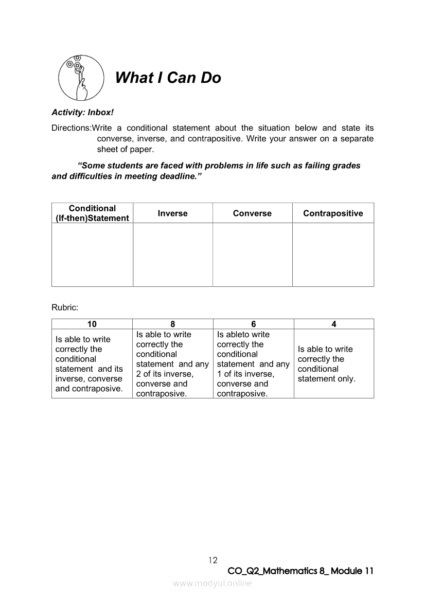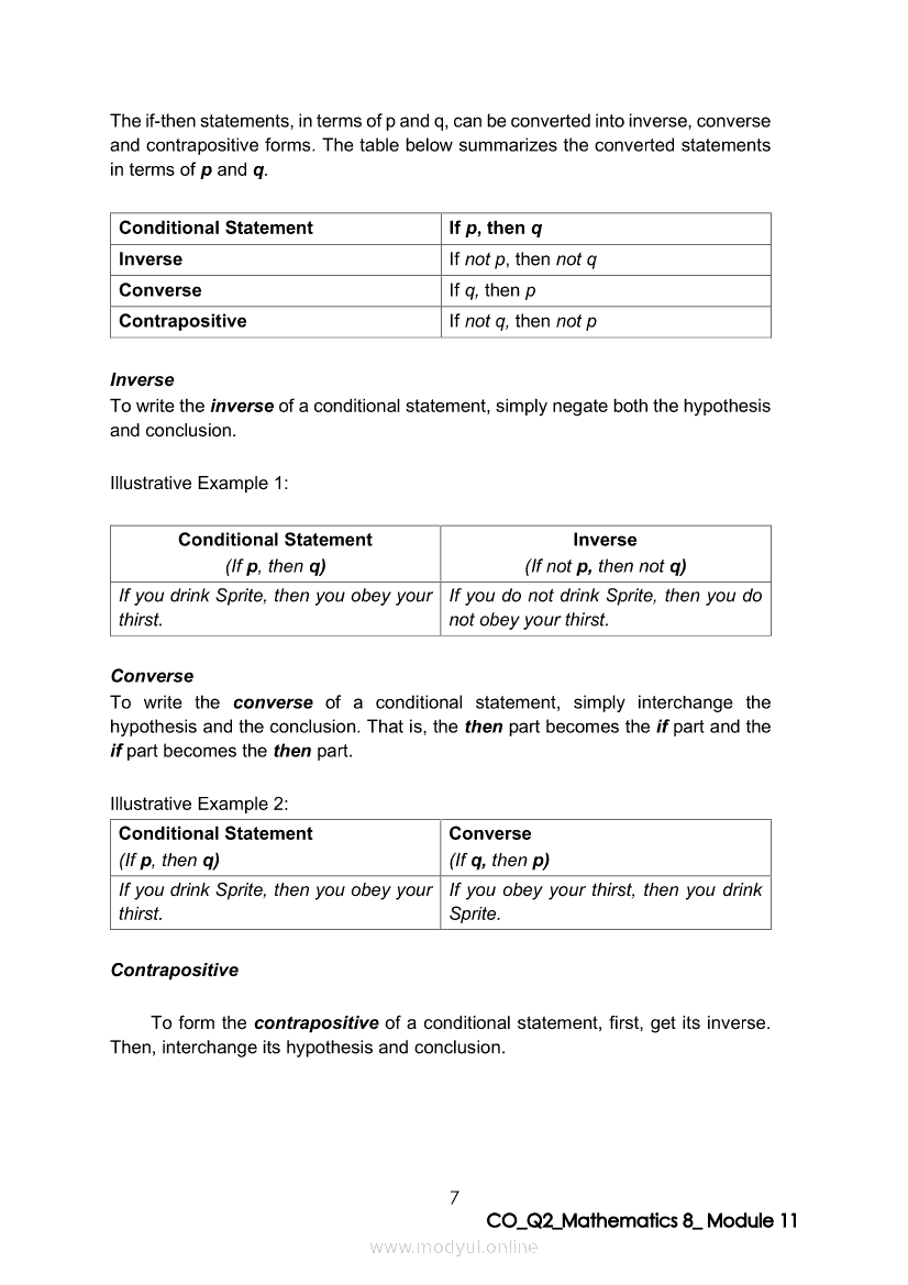 Math 8 Quarter 2 – Module 11: Determining the Inverse, Converse and Contrapositive of an If-then StatementApr 22, 2021 Grade 8Xiaomi Redmi Watch 5 Active 2inch LCD Display Clear Calling 5ATM Waterproof Smart Watch for only ₱3,999 ₱1,200!. Math 8RelatedMATHEMATICS Quarter 4 – Module 4 Properties of Parallel Lines Cut by a TransversalMATHEMATICS Quarter 4 – Module 2 Theorems on Triangle InequalitiesMATHEMATICS Quarter 4 - Module 5 Parallel Lines and Perpendicular LinesMATHEMATICS Quarter 4 - Module 3 Proving Inequalities in a TriangleMATHEMATICS Quarter 4 – Module 1 Inequalities in Triangles