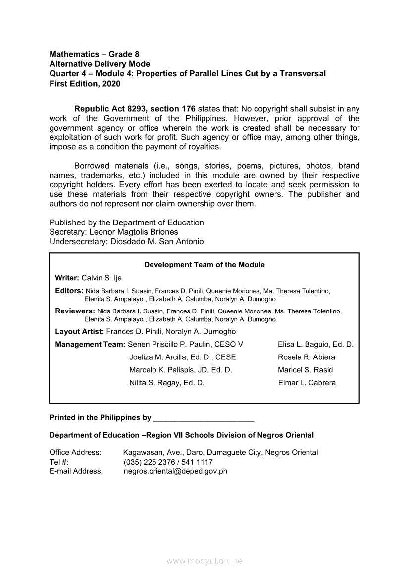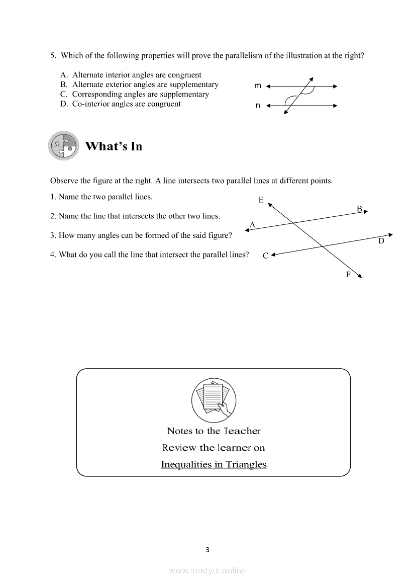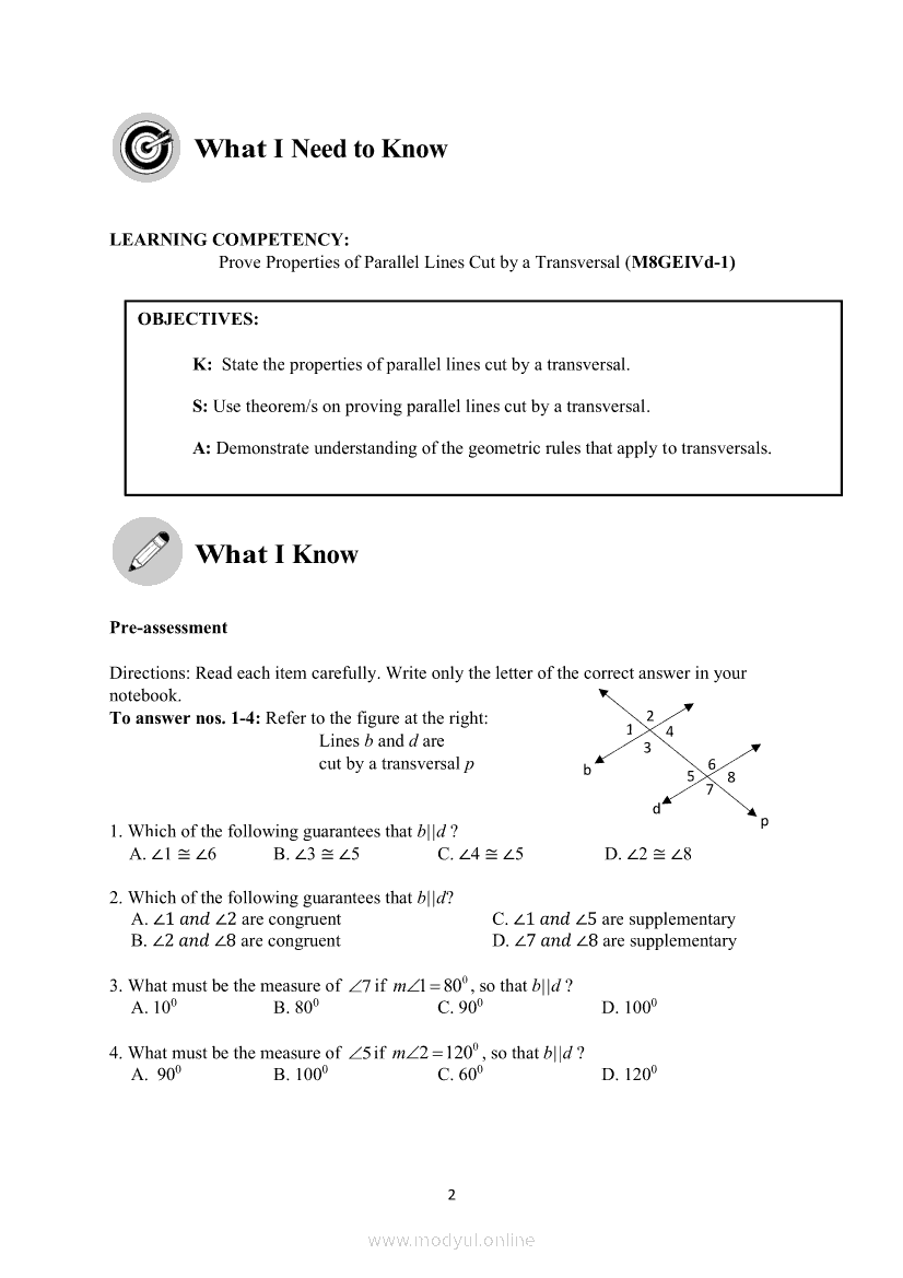 MATHEMATICS Quarter 4 – Module 4 Properties of Parallel Lines Cut by a TransversalMay 27, 2021 Grade 8Xiaomi Redmi Watch 5 Active 2inch LCD Display Clear Calling 5ATM Waterproof Smart Watch for only ₱3,999 ₱1,200!. Math 8 4th QuarterRelatedMATHEMATICS Quarter 4 - Module 3 Proving Inequalities in a TriangleMATHEMATICS Quarter 4 – Module 6 Basic Concepts of ProbabilityMATHEMATICS Quarter 4 – Module 7 Probabilities of Simple EventsMATHEMATICS Quarter 4 - Module 5 Parallel Lines and Perpendicular LinesMATHEMATICS Quarter 4 – Module 1 Inequalities in Triangles
