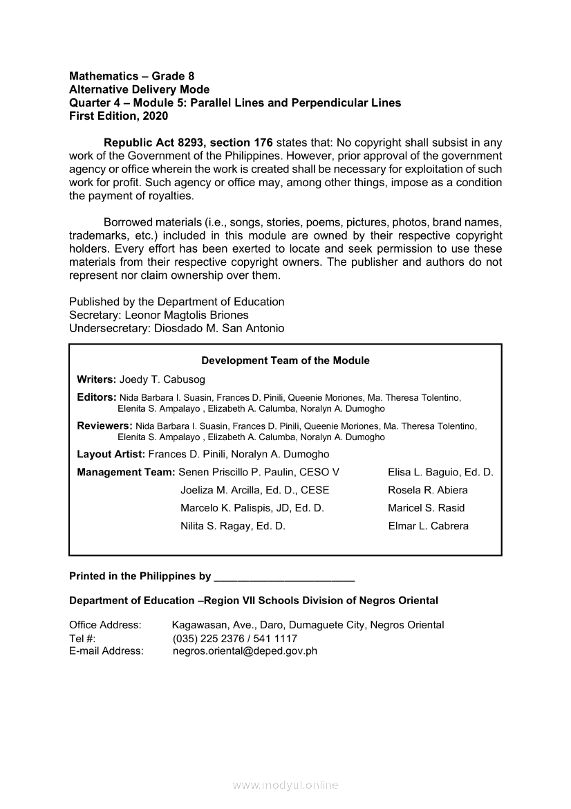 MATHEMATICS Quarter 4 - Module 5 Parallel Lines and Perpendicular LinesMay 27, 2021 Grade 8Xiaomi Redmi Watch 5 Active 2inch LCD Display Clear Calling 5ATM Waterproof Smart Watch for only ₱3,999 ₱1,200!. Math 8 4th QuarterRelatedMATHEMATICS Quarter 4 – Module 8 Probability of an Event Experimental and TheoreticalMATHEMATICS Quarter 4 – Module 4 Properties of Parallel Lines Cut by a TransversalMATHEMATICS Quarter 4 – Module 1 Inequalities in TrianglesMATHEMATICS Quarter 4 - Module 3 Proving Inequalities in a TriangleMATHEMATICS Quarter 4 – Module 2 Theorems on Triangle Inequalities