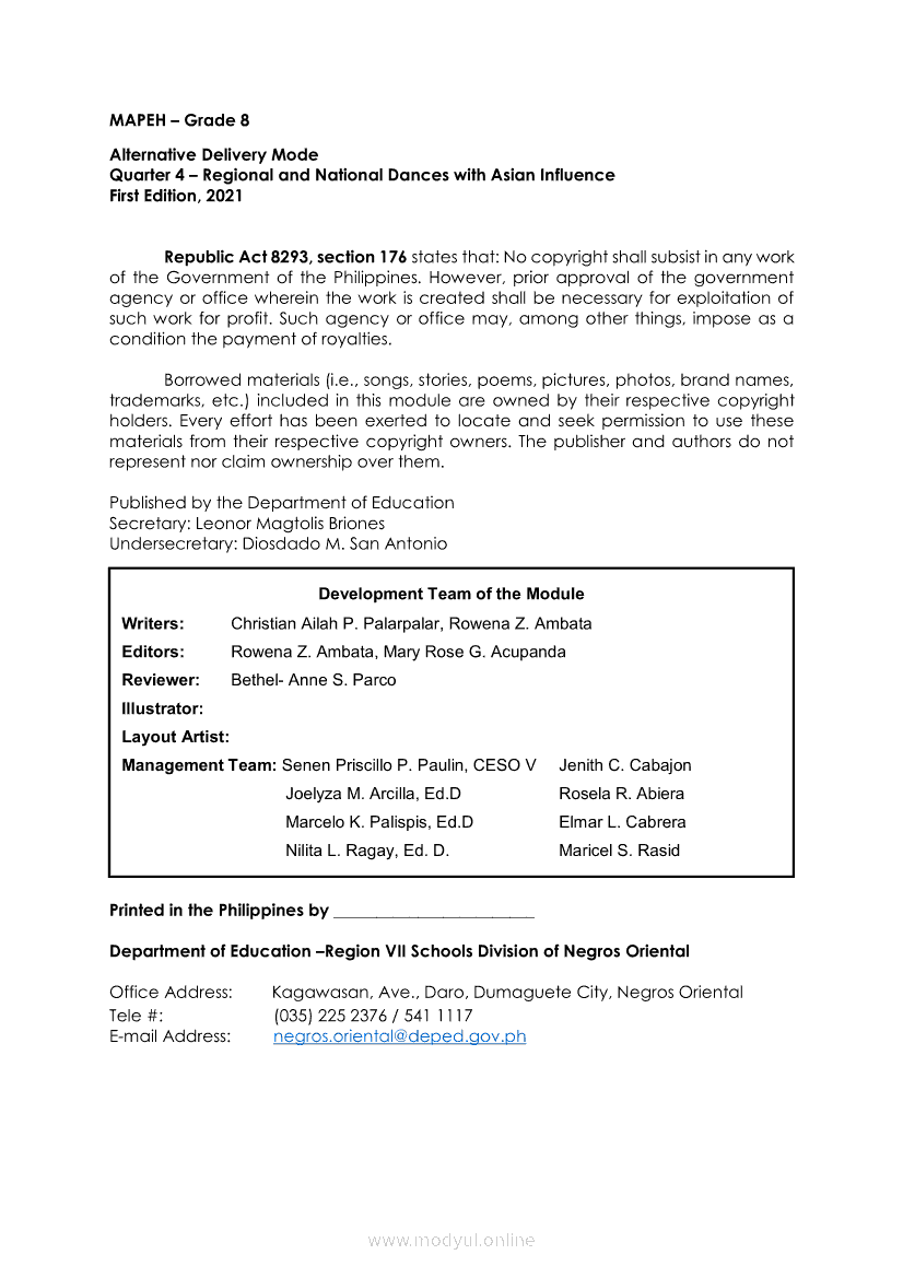 PHYSICAL EDUCATION Quarter 4 – Module 4b: Regional and National Dances with Asian InfluenceMay 27, 2021 Grade 8Xiaomi Redmi Watch 5 Active 2inch LCD Display Clear Calling 5ATM Waterproof Smart Watch for only ₱3,999 ₱1,200!. PE 8 4th QuarterRelatedPhysical Education Quarter 4 – Module 4a: Folk DancesAraling Panlipunan Ikaapat na Markahan – Modyul 7 EPEKTO NG MGA IDEOLOHIYA, NG COLD WAR AT NEOKOLONYALISMO SA IBA’T IBANG BAHAGI NG DAIGDIGMATHEMATICS Quarter 4 – Module 6 Basic Concepts of ProbabilityPREDICT PHENOTYPIC EXPRESSIONS OF TRAITS for Science Grade 8 Quarter 4 / Week 3Araling Panlipunan Ikaapat na Markahan – Modyul 4: Ang Bunga ng Ikalawang Digmaang Pandaigdig